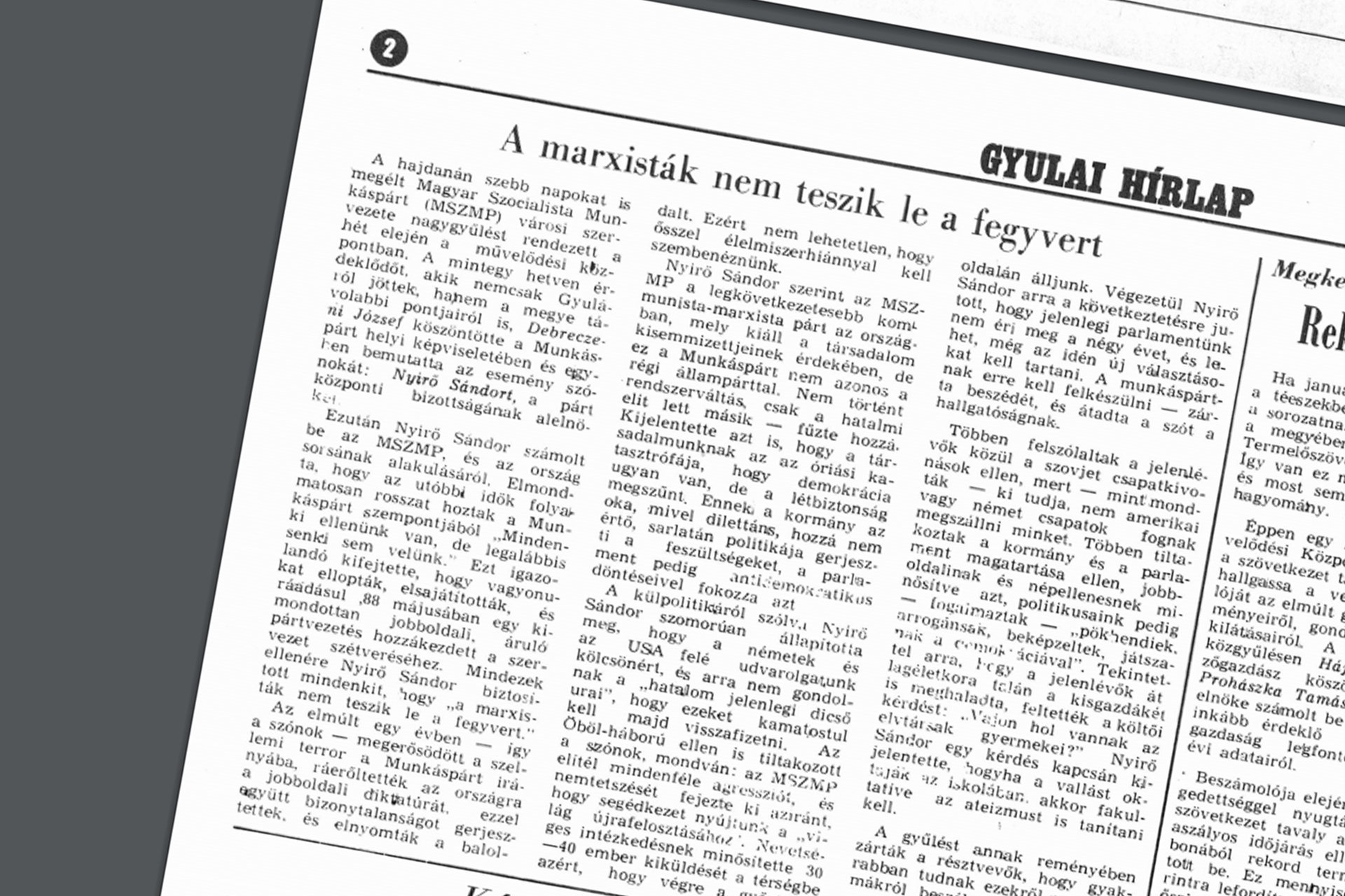 A hajdanán szebb napokat is megélt Magyar Szocialista Munkáspárt (MSZMP) városi szervezete nagygyűlést rendezett a hét elején a művelődési központban (…) Többen felszólaltak a jelenlévők közül a szovjet csapatkivonások ellen, mert – mint mondták – ki tudja, nem amerikai vagy német csapatok fognak megszállni minket (…) Tekintettel arra, hogy a jelenlévők átlagéletkora talán a kisgazdákét is meghaladta, feltették a költői kérdést: „Vajon hol vannak az elvtársak gyermekei?” Nyirő Sándor egy kérdés kapcsán kijelentette, hogyha a vallást oktatják az iskolában, akkor fakultatíve az ateizmust is tanítani kell (…)