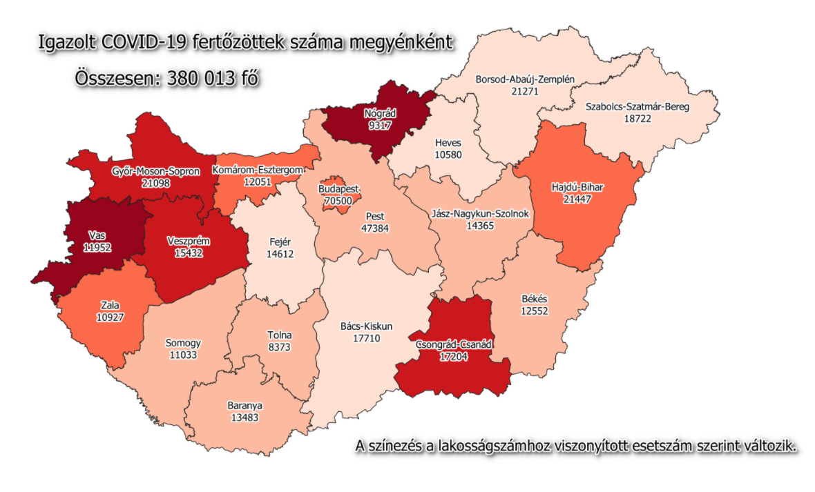 A kormányzati portálon azt írták: 380 013-ra nőtt a Magyarországon azonosított fertőzöttek száma. Az elhunytaké 13 347-re emelkedett, a gyógyultak száma 285 022.