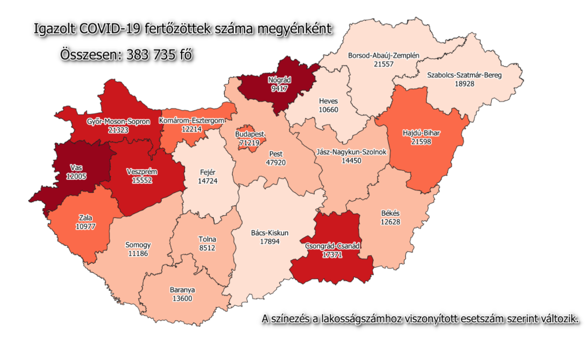 A kormányzati portálon azt írták: 383 735-re nőtt a Magyarországon azonosított fertőzöttek száma. Az elhunytaké 13 543-ra emelkedett, a gyógyultak száma 289 520.