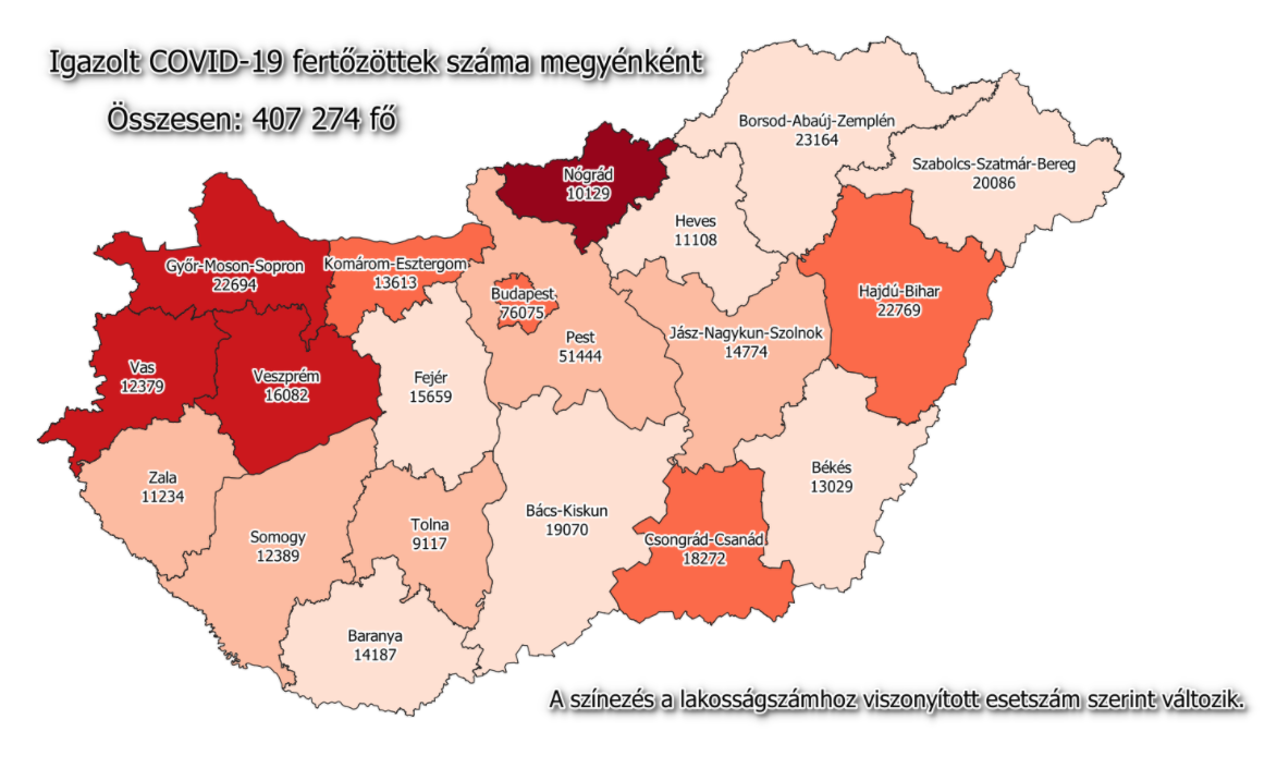 A kormányzati portálon azt írták: 407 274-re nőtt a Magyarországon azonosított fertőzöttek száma. Az elhunytaké 14 450-re emelkedett, a gyógyultak száma 310 848.