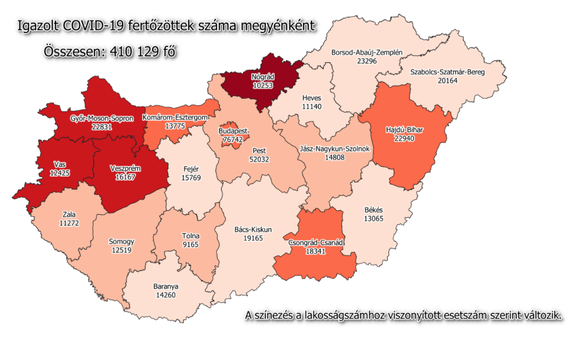 A kormányzati portálon azt írták: 410 129-re nőtt a Magyarországon azonosított fertőzöttek száma. Az elhunytaké 14 552-re emelkedett, a gyógyultak száma 313 450.