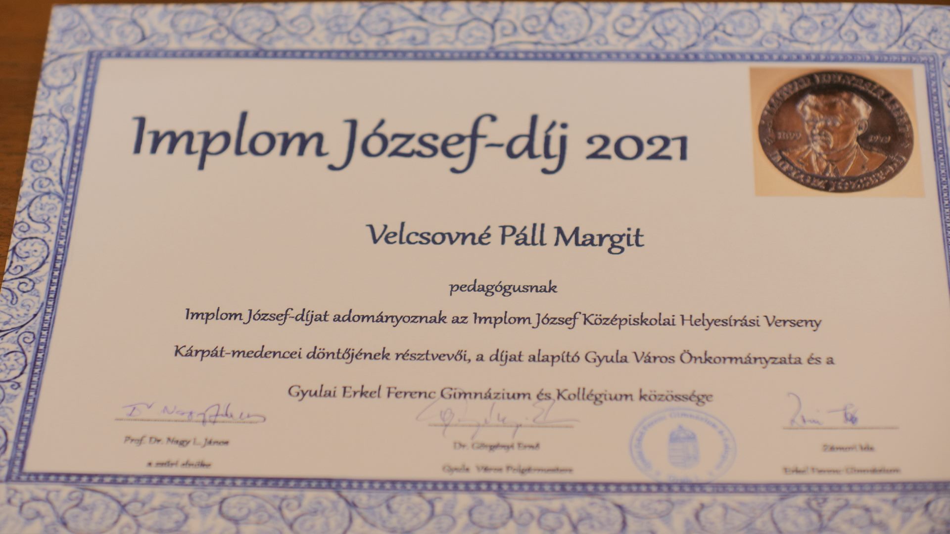 Nagy L. János zsűrielnök elmondta: idén nemcsak a verseny, de az Implom-díj is jubilál, hiszen tizenötödik alkalommal adják át. Idén Velcsovné Páll Margit nagyszentmiklósi magyartanár és Ördög-Gyárfás Lajos, az Anyanyelvápolók Erdélyi Szövetségének ügyvezető elnöke vehette át az elismerést.