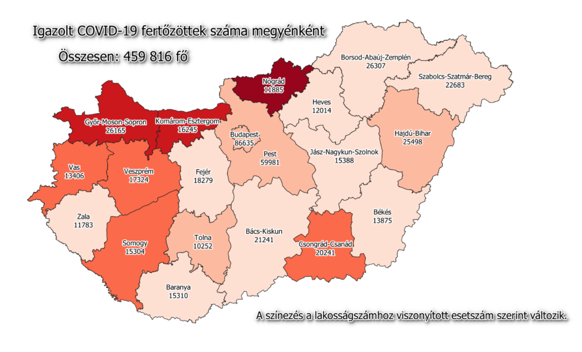 A kormányzati portálon azt írták: 459 816-ra nőtt a Magyarországon azonosított fertőzöttek száma. Az elhunytaké 15 765-re emelkedett, a gyógyultak száma 333 045.