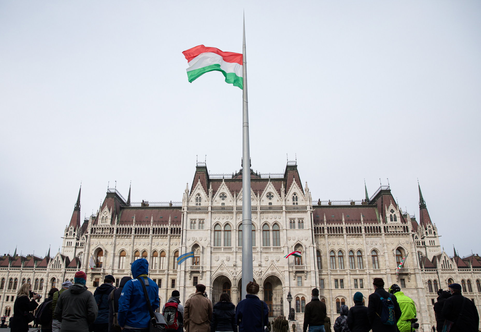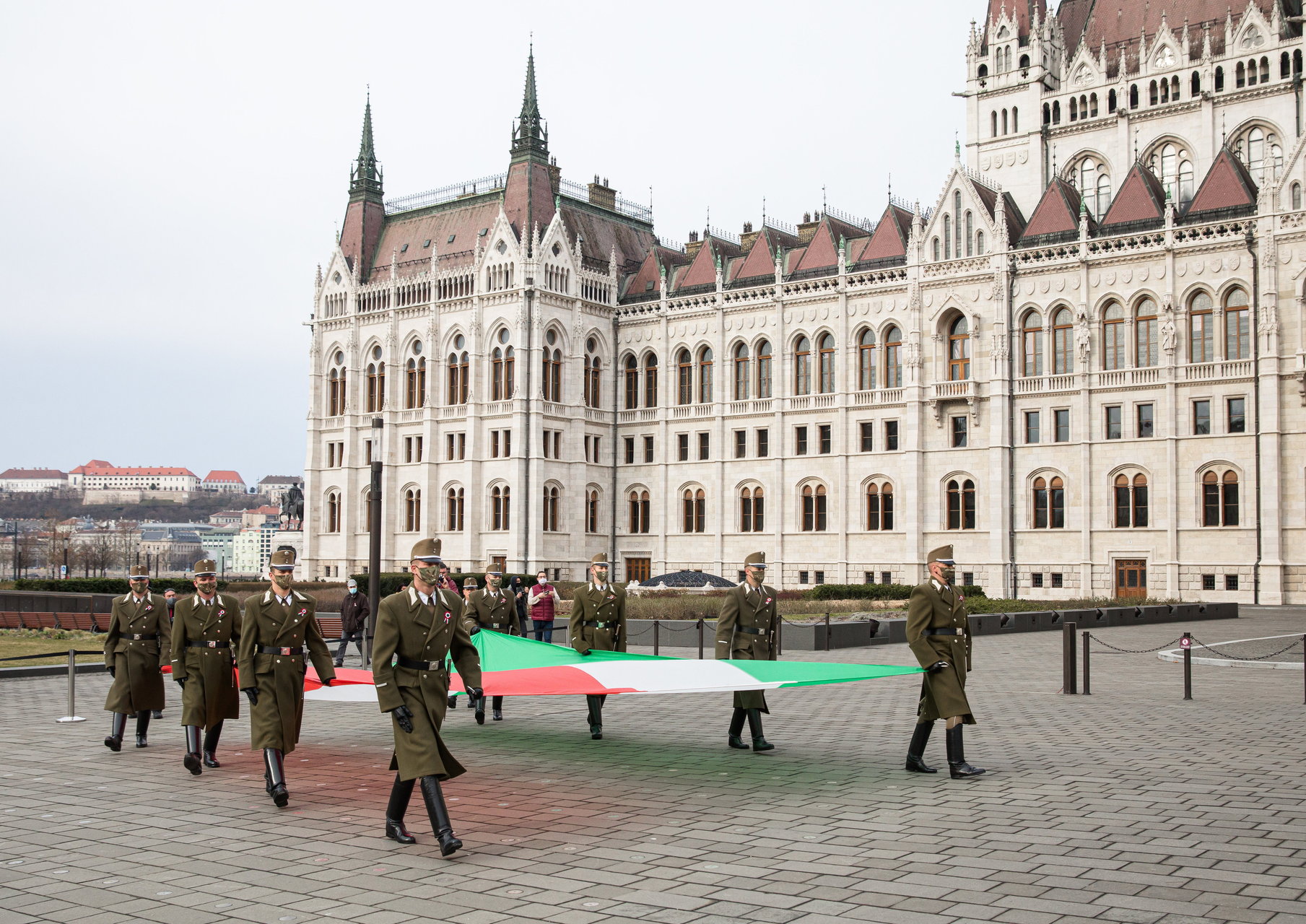 Katonai tiszteletadás mellett felvonták a nemzeti lobogót az Országház előtt a március 15-ei nemzeti ünnepen, hétfő reggel.