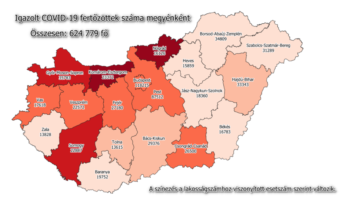 A kormányzati portálon azt írták: 624 779-re nőtt a Magyarországon azonosított fertőzöttek száma. Az elhunytaké 19 752-re emelkedett, a gyógyultak száma 393 999.