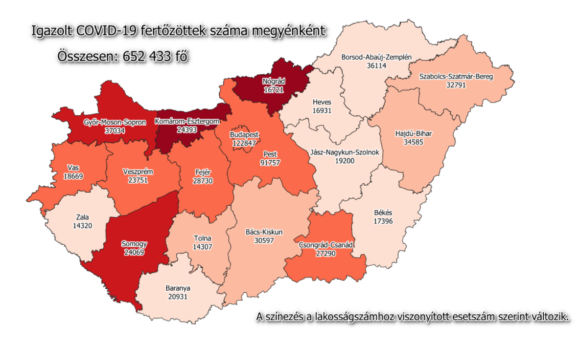 A kormányzati portálon azt írták: 652 433-ra nőtt a Magyarországon azonosított fertőzöttek száma. Az elhunytaké 20 737-re emelkedett, a gyógyultak száma 406 935.