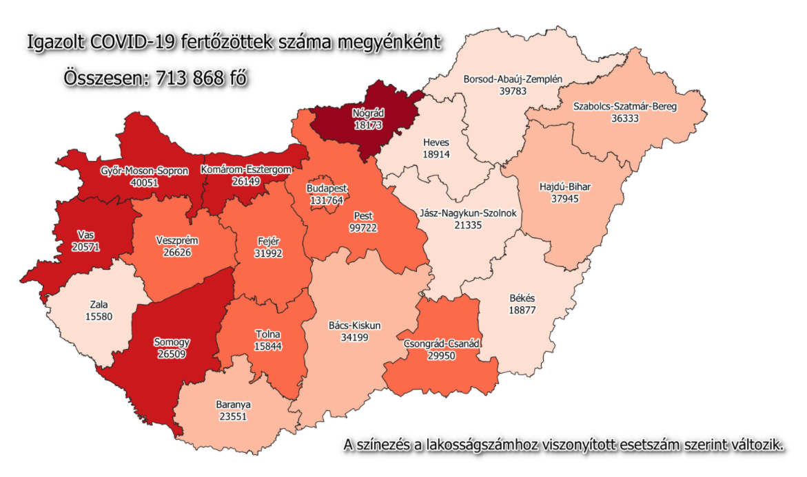 A kormányzati portálon azt írták: 713 868-ra nőtt a Magyarországon azonosított fertőzöttek száma. Az elhunytaké 23 211-re, a gyógyultaké 423 366-ra emelkedett.
