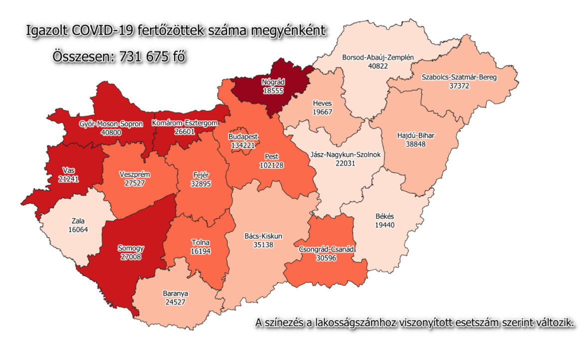 A kormányzati portálon azt írták: 731 675-re nőtt a Magyarországon azonosított fertőzöttek száma. Az elhunytaké 24 265-re, a gyógyultaké 435 344-re emelkedett.