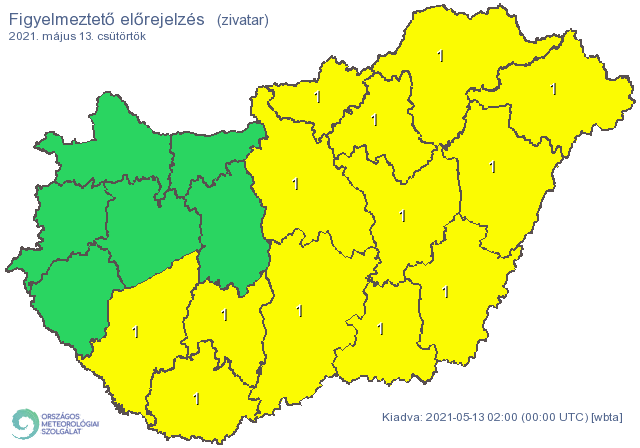 Veszélyjelzésükben azt írták: csütörtökön az Észak-Dunántúlt leszámítva elszórtan alakulhatnak ki zivatarok. Főként délkeleten a délutáni órákban egy-egy intenzívebb zivatar is előfordulhat, 70 km/h-t meghaladó széllökésekkel, jégesővel, néhol rövid idő alatt jelentősebb mennyiségű csapadékkal (20–25 mm).