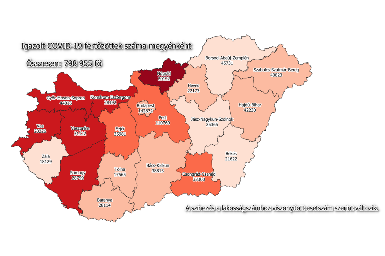 A kormányzati portálon azt írták: 798 955-re nőtt a Magyarországon azonosított fertőzöttek száma. Az elhunytaké 29 277-re, a gyógyultaké 640 964-re emelkedett.