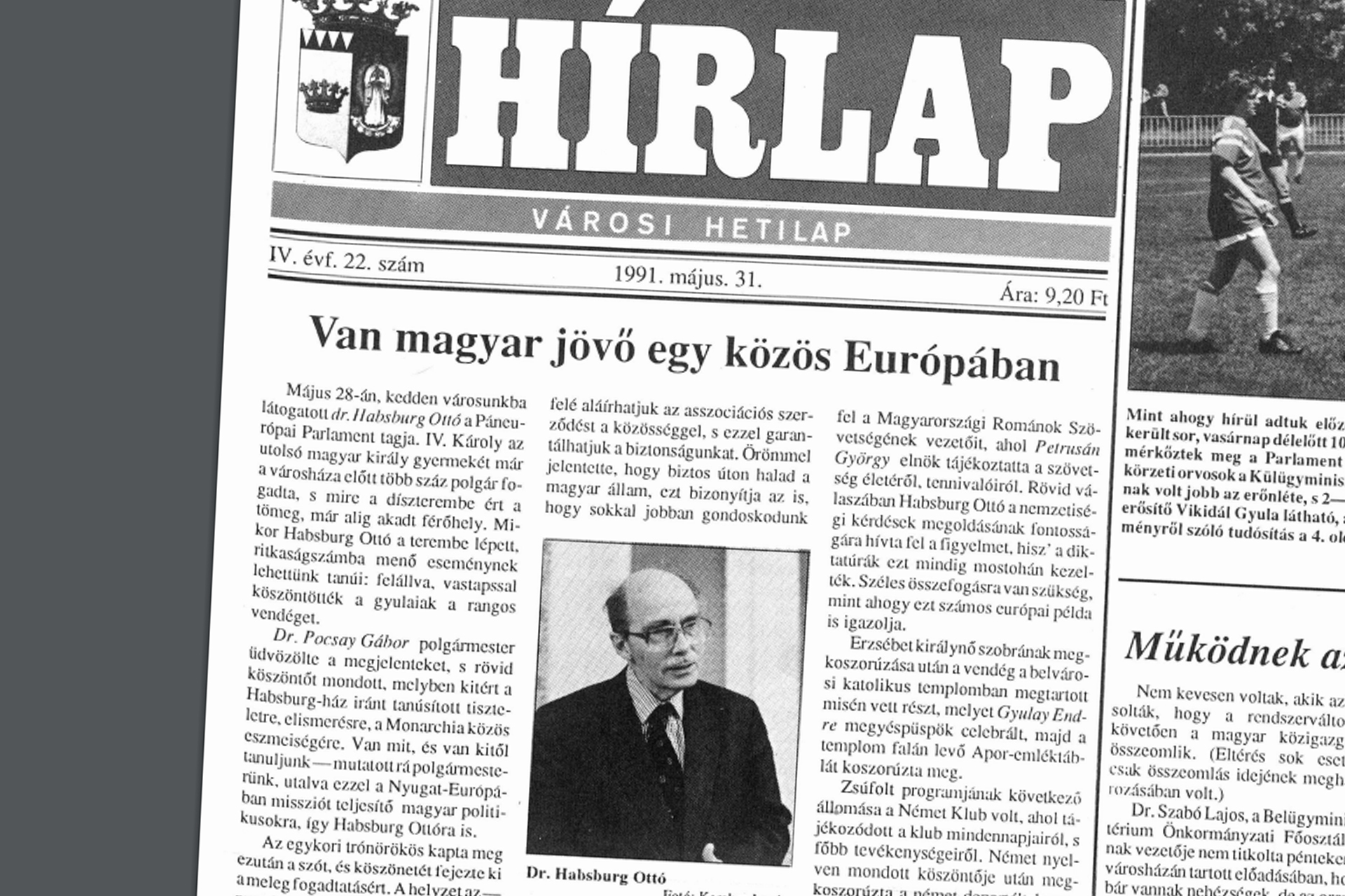 Május 28-án, kedden városunkba látogatott dr. Habsburg Ottó a Páneurópai Parlament tagja. IV. Károly az utolsó magyar király gyermekét már a városháza előtt több száz polgár fogadta, s mire a díszterembe ért a tömeg, már alig akadt férőhely. Mikor Habsburg Ottó a terembe lepett, ritkaságszámba menő eseménynek lehettünk tanúi: felállva, vastapssal köszöntötték a gyulaiak a rangos vendéget. Dr. Pocsay Gábor polgármester üdvözölte a megjelenteket, s rövid köszöntőt mondott, melyben kitért a Habsburg-ház iránt tanúsított tiszteletre, elismerésre, a Monarchia közös eszmeiségére. Van mit, és van kitől tanuljunk – mutatott rá polgármesterünk, utalva ezzel a Nyugat-Európában missziót teljesítő magyar politikusokra, így Habsburg Ottóra is. Az egykori trónörökös kapta meg ezután a szót, és köszönetét fejezte ki a meleg fogadtatásért. A helyzet az – mondta a vendég –, hogy két év alatt sokat haladtunk. Többen sajnálják, hogy nem mennek gyorsabban a dolgok, de Habsburg Ottó figyelmeztetett arra, hogy több évtized pusztítását nem lehet pár év alatt jóvá lenni (…)