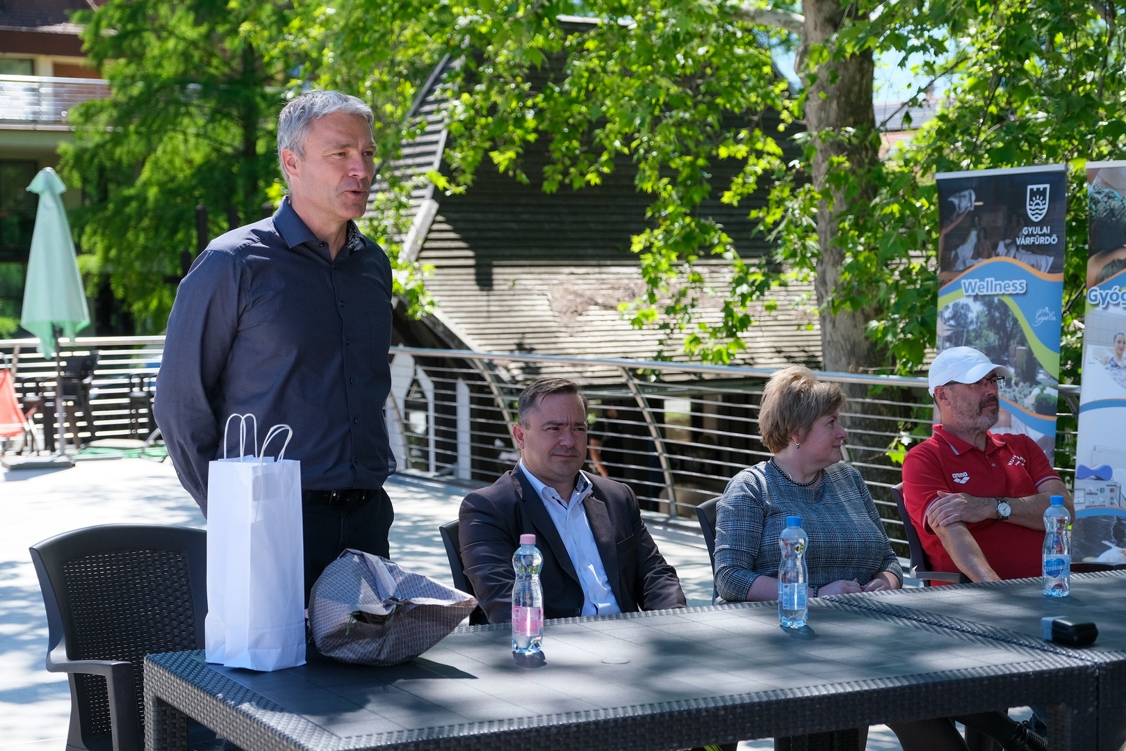 Képünkön (balról jobbra):Kun Miklós, a Gyulai Várfürdő Kft. ügyvezető igazgatója, Kónya István alpolgármester, Kiss Tamásné, a Gyulai Úszókért Alapítvány elnöke és Tóth András vezetőedző