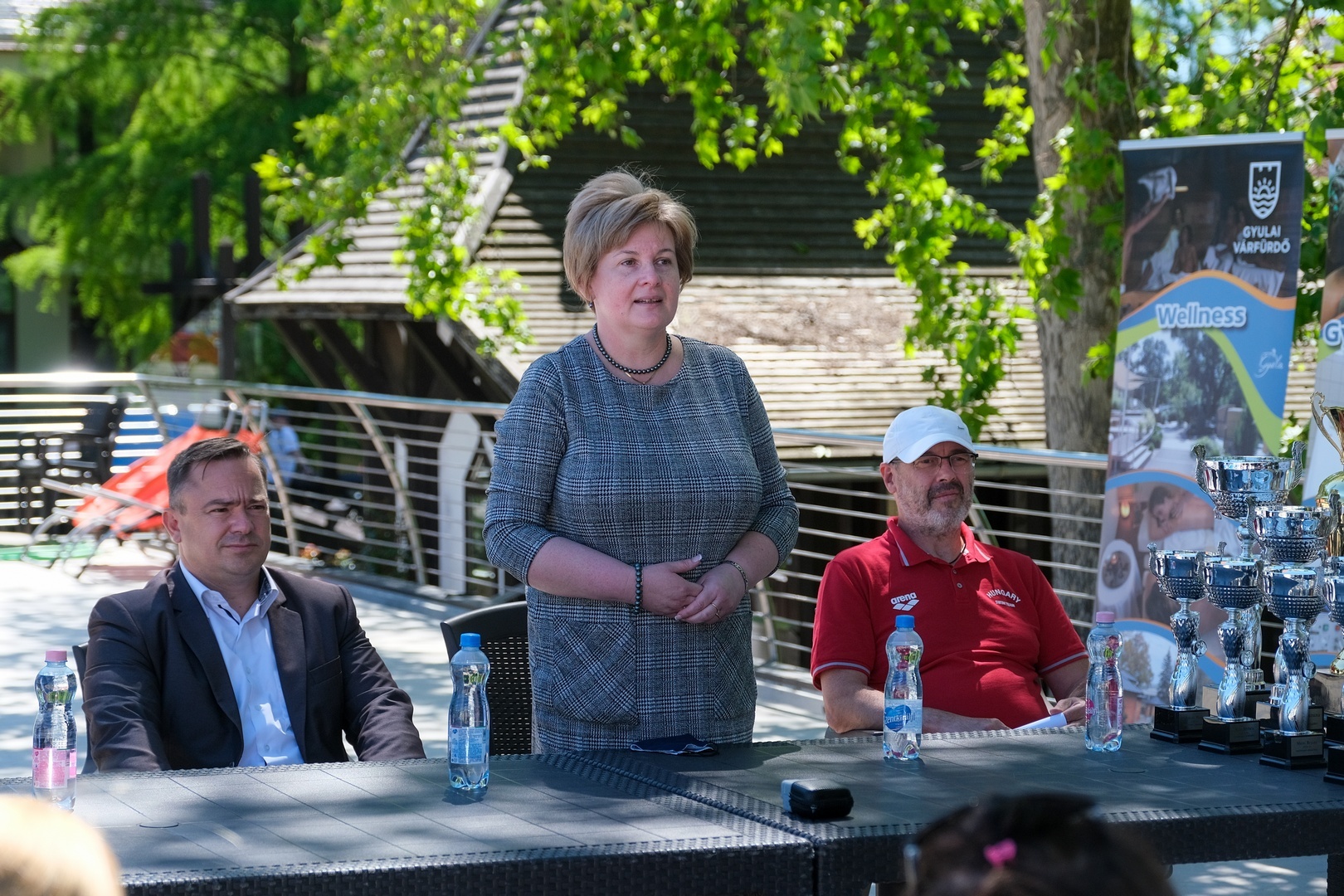 Kiss Tamásné, a Gyulai Úszókért Alapítvány elnöke beszédében a szervezet munkájának jelentőségére hívta fel a figyelmet. Kifejtette, az alapítvány a világjárvány ellenére is fontos támogatója és segítője volt a gyulai úszósportnak.
