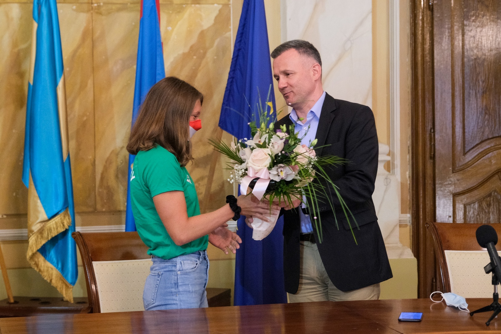 Görgényi Ernő polgármester köszöntötte Veres Laurát május 31-én a gyulai városházán. Az úszó Európa-bajnokságon ezüstérmet szerzett úszónőt ajándékcsomaggal és virágcsokorral lepte meg a városvezető.