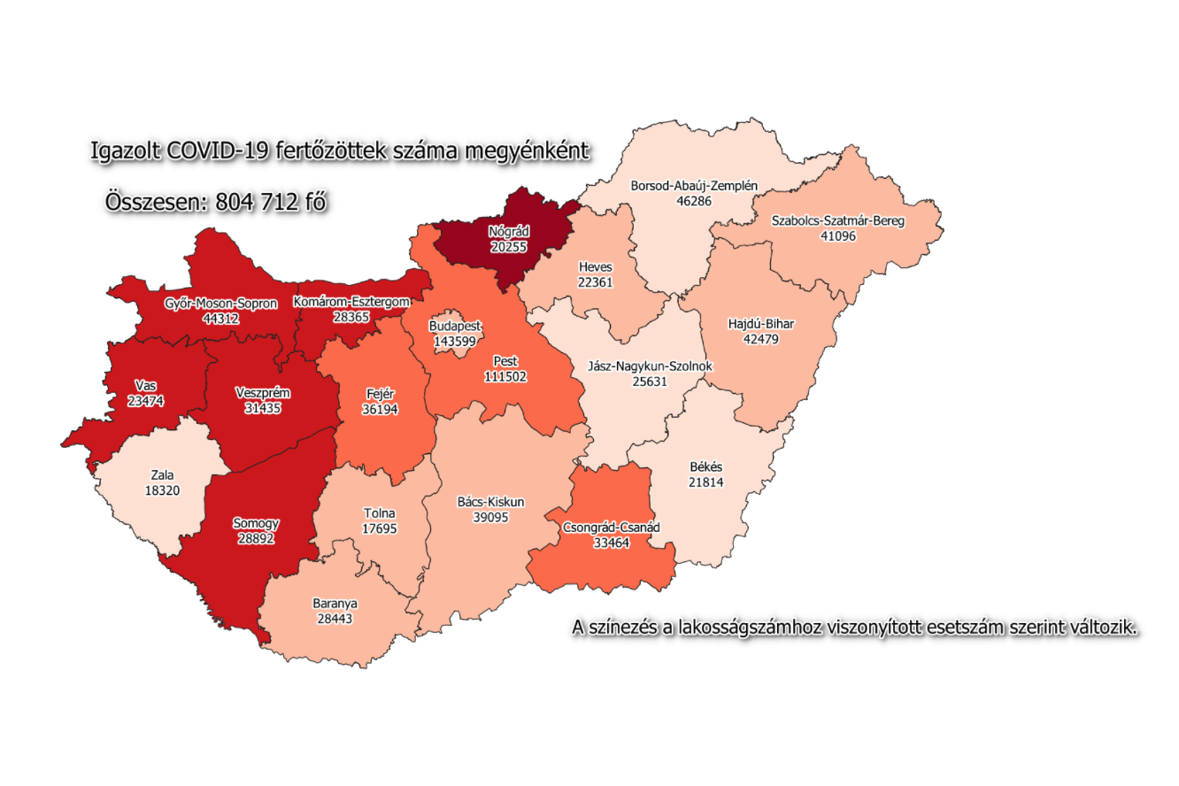 A kormányzati portálon azt írták: 804 712-re nőtt a Magyarországon azonosított fertőzöttek száma. Az elhunytaké 29 761-re, a gyógyultaké 703 352-re emelkedett.