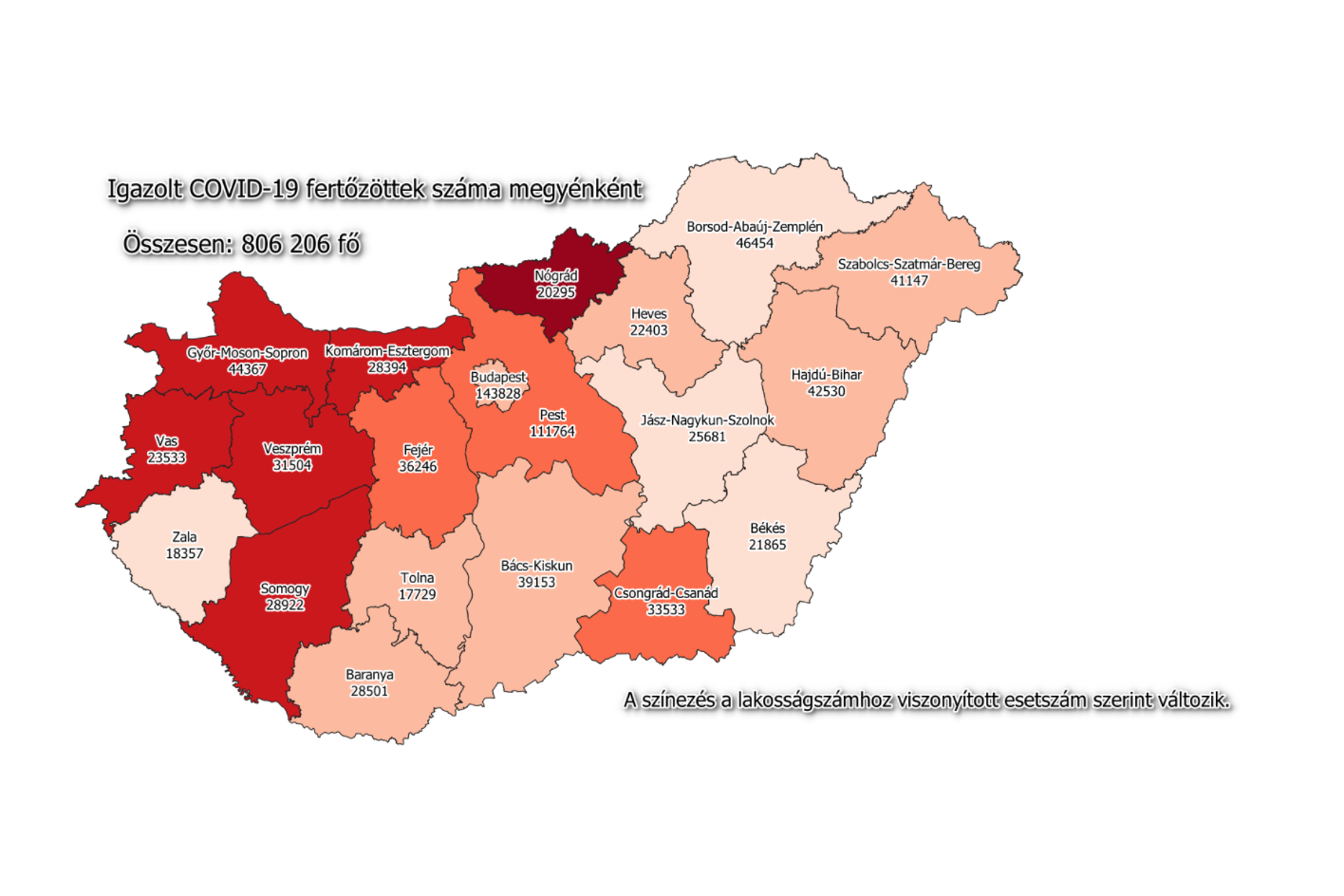 A kormányzati portálon azt írták: 806 206-ra nőtt a Magyarországon azonosított fertőzöttek száma. Az elhunytaké 29 883-ra, a gyógyultaké 718 577-re emelkedett.