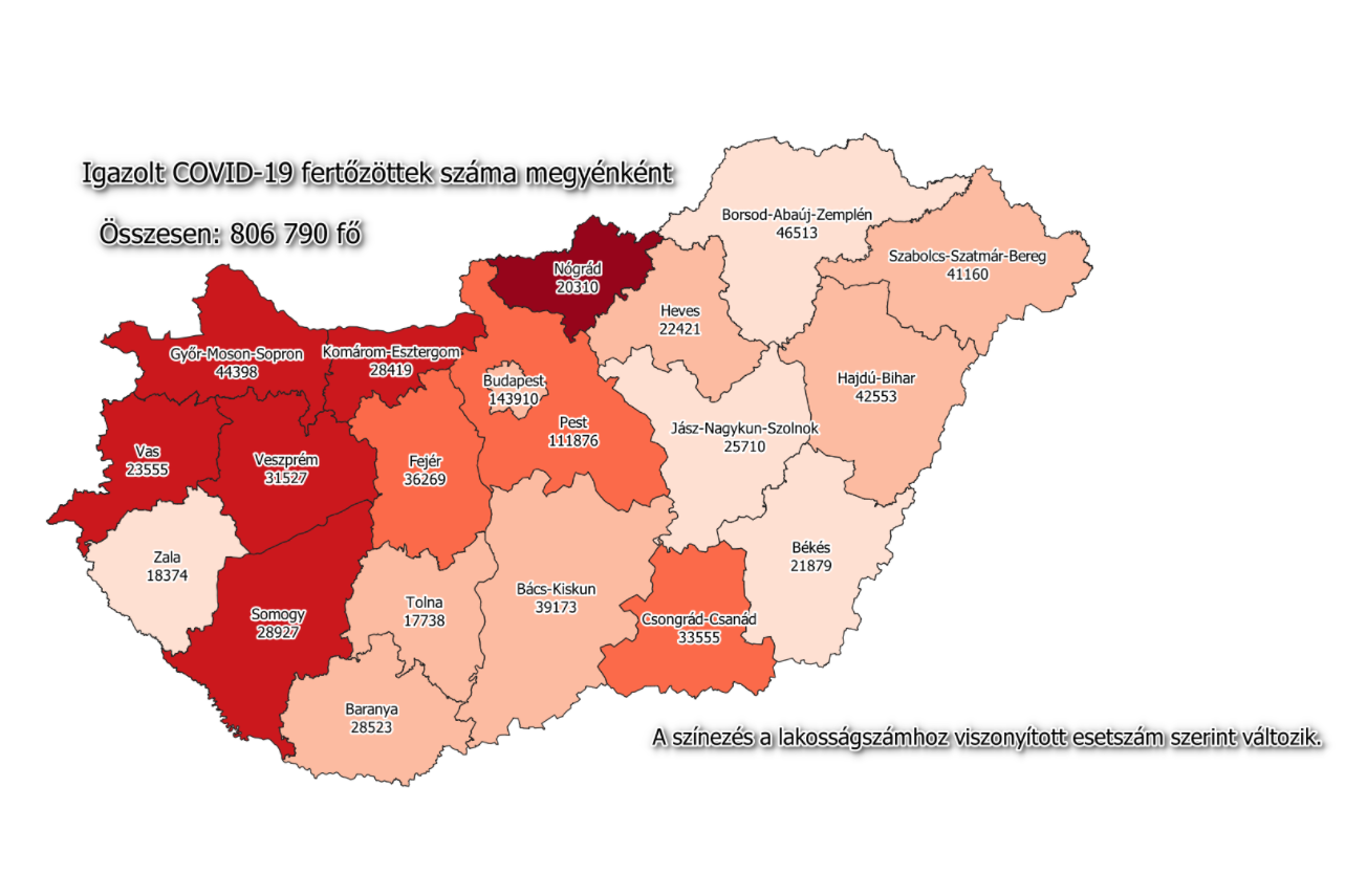 A kormányzati portálon azt írták: 806 790-re nőtt a Magyarországon azonosított fertőzöttek száma. Az elhunytaké 29 904-re, a gyógyultaké 724 614-re emelkedett.