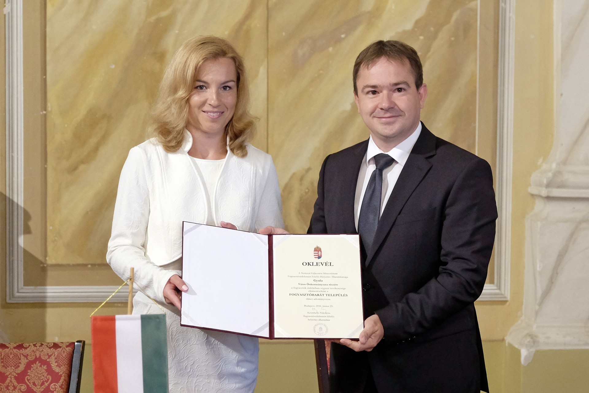 5 évvel ezelőtt, 2016. június 23-án Fogyasztóbarát Település címet vette át Gyula városa egyedüli Békés megyei településként a gyulai városháza dísztermébe szervezett ünnepélyes átadó ceremónián. Az eseményen megjelent Keszthelyi Nikoletta fogyasztóvédelemért felelős helyettes államtitkár, Kónya István alpolgármester, Dobókői György, a Békés Megyei Kormányhivatal Műszaki Engedélyezési és Fogyasztóvédelmi Főosztály főosztályvezetője, Susánszki György, a Békés Megyei Kormányhivatal műszaki engedélyezési és fogyasztóvédelmi főosztályának szakügyintézője és Gulyás Imre, a Gyulai Járási Hivatal vezetője. Ezzel a címmel a Nemzeti Fejlesztési Minisztérium (=NFM) elismeri a települések fogyasztókért tett intézkedéseit, értékelik a hozzáállását, amellyel a területükön működő vállalkozások között a fogyasztóbarát szemlélet általánossá válásához és a fogyasztók helyzetének javításához járulnak hozzá. A cím odaítélésénél előnyben részesült az a település, amely támogatja a helyi közoktatási intézményekben történő rendszeres fogyasztóvédelmi oktatások megtartását, kiemelt figyelmet fordít a fiatalkorúak védelmére és rendszeresen figyelemmel kíséri a helyi szervezésű árubemutatóval egybekötött termékértékesítéssel, illetve a fogyasztói csoportok szervezésével kapcsolatos tevékenységeket. Fontos szempont volt továbbá, hogy az általa szervezett fesztiválokon, illetve egyéb rendezvényeken rendszeresen biztosítsa az NFM, a Nemzeti Fogyasztóvédelmi Hatóság, illetve a megyei kormányhivatal fogyasztóvédelmi felügyelőségének kitelepülését a fogyasztók, illetve a helyi vállalkozások szakmai tájékoztatásának céljából.