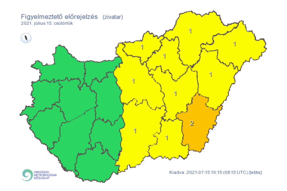 Veszélyjelzésükben azt írták: napközben főként a Tisza vonalától keletre lehetnek zivatarok. A leghevesebb cellákhoz felhőszakadás, jégeső (jellemzően 1–2 cm, de néhol akár 2–4 cm) és viharos (jellemzően 60–80 km/órás, néhol ezt meghaladó) széllökés is társulhat.