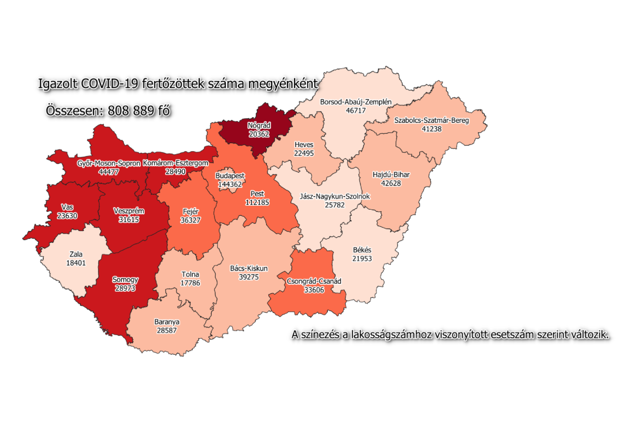 A kormányzati portálon azt írták: 808 889-re nőtt a Magyarországon azonosított fertőzöttek száma. Az elhunytak száma 30 019-re, a gyógyultaké 743 449-re emelkedett.