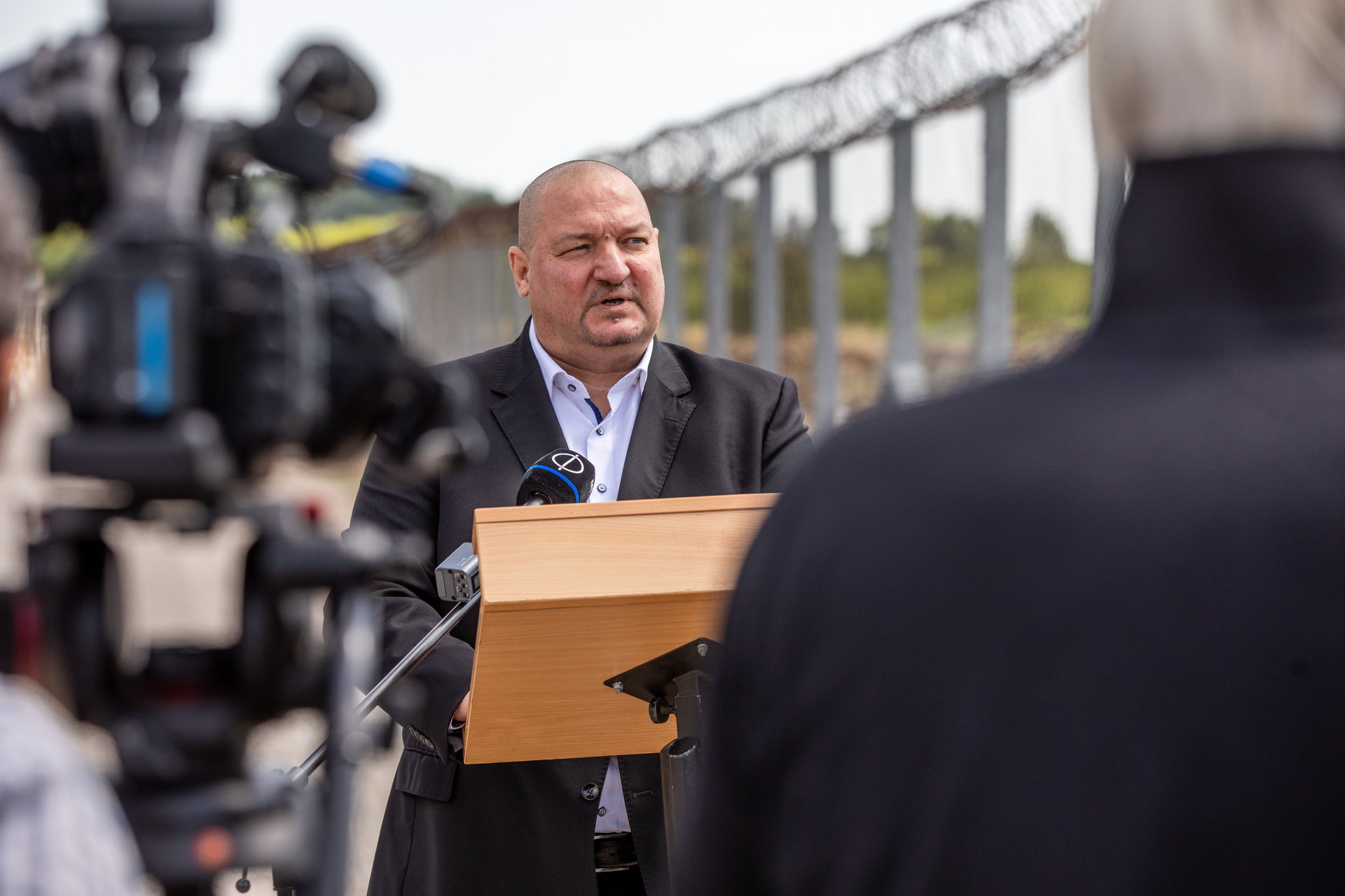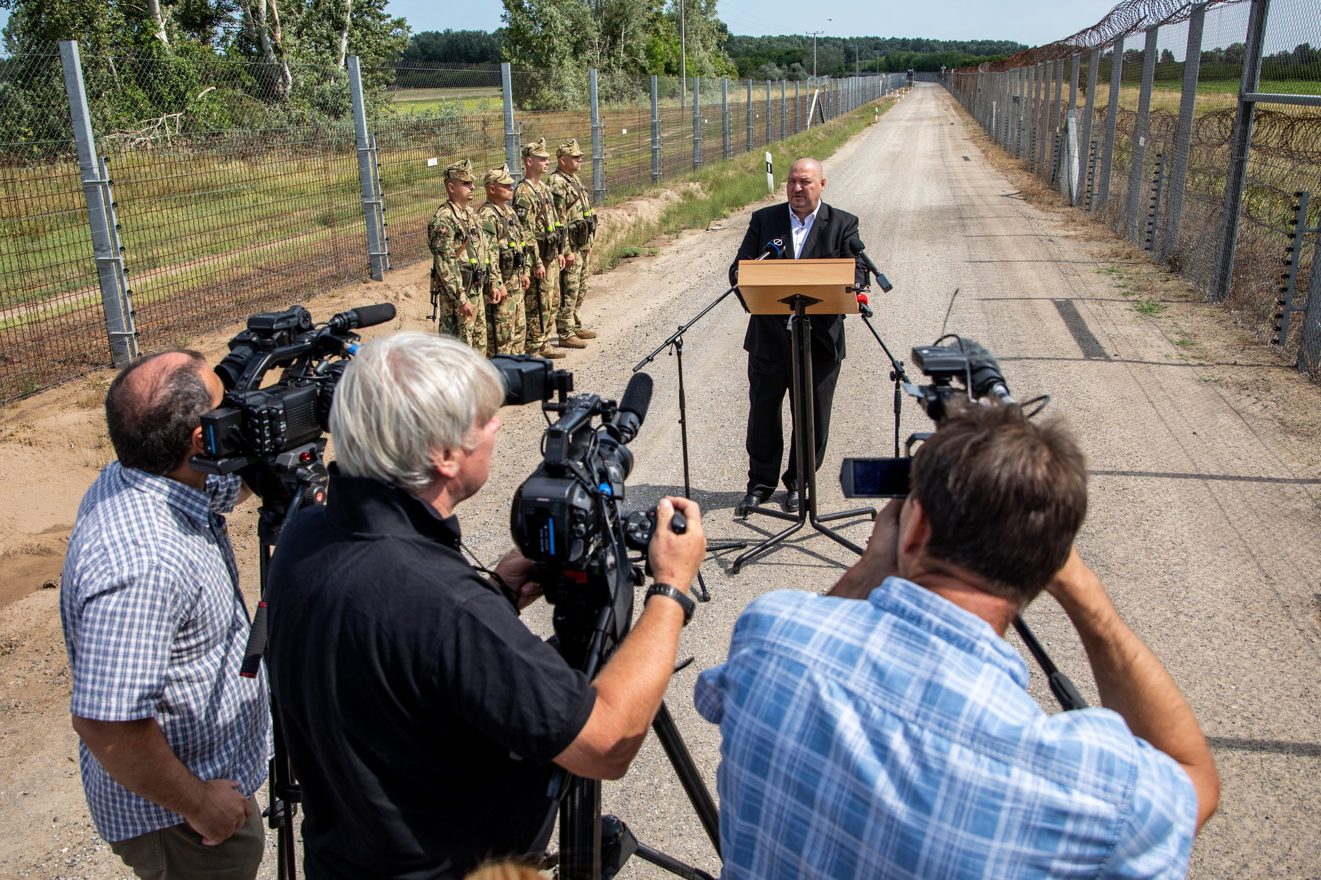 Németh Szilárd, a Honvédelmi Minisztérium parlamenti államtitkára sajtótájékoztatót tart az ideiglenes biztonsági határzárnál a magyar–szerb határon, Ásotthalomnál 2021. augusztus 2-án