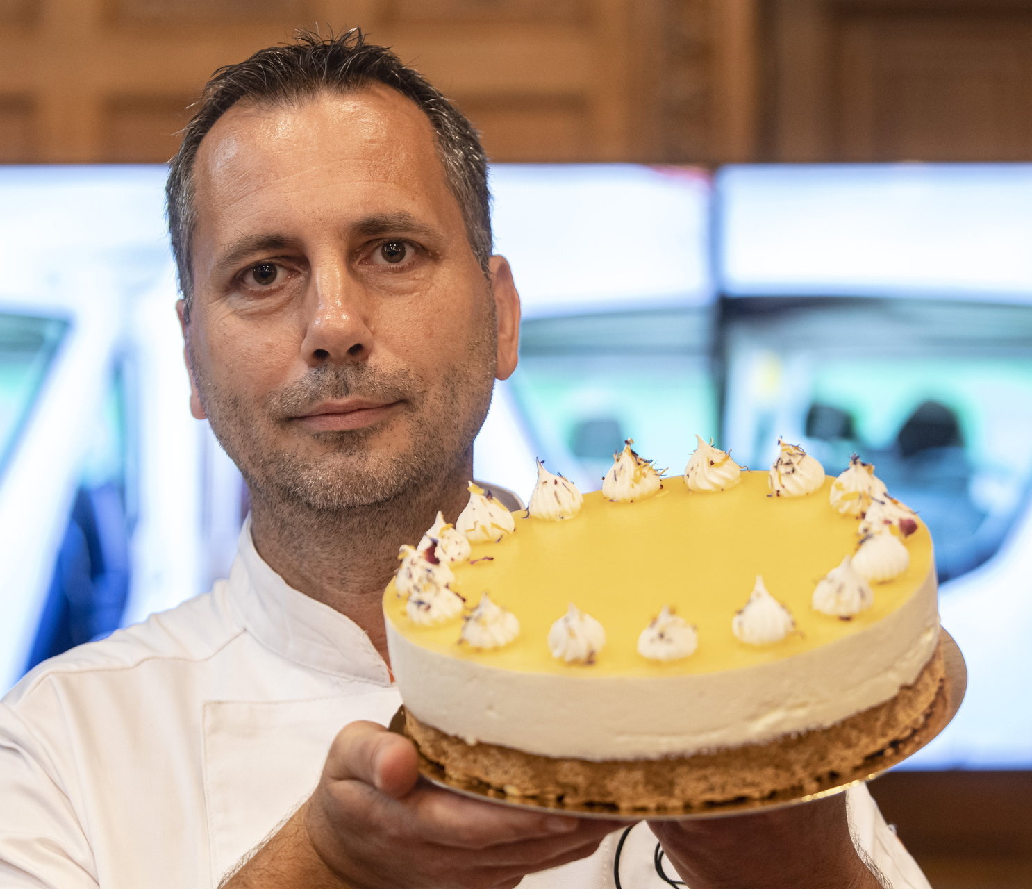 Fodor Sándor, a budapesti Habcsók Cukrászda mestercukrásza a Magyarország tortája címet elnyert Napraforgó nevű tortájával az Országház Vadásztermében az augusztus 20-i nemzeti ünnepről tartott sajtótájékoztatón 2021. augusztus 3-án