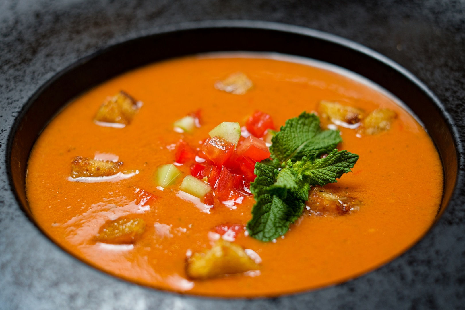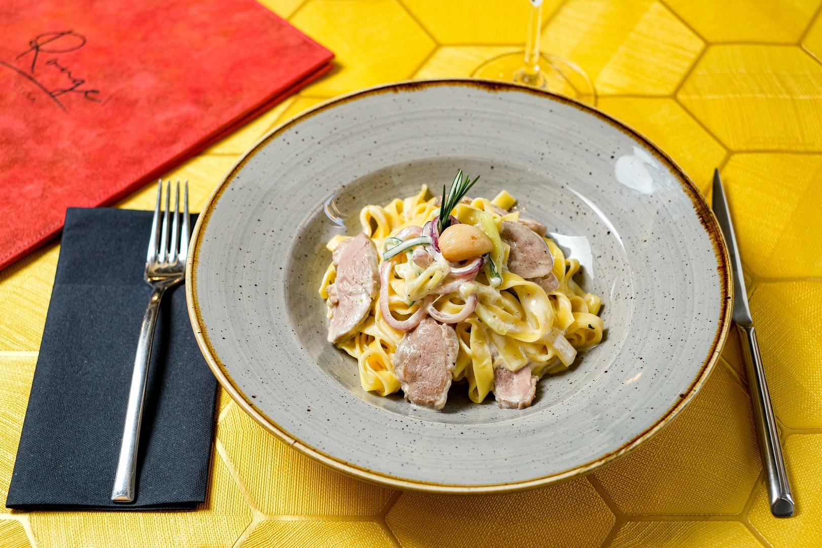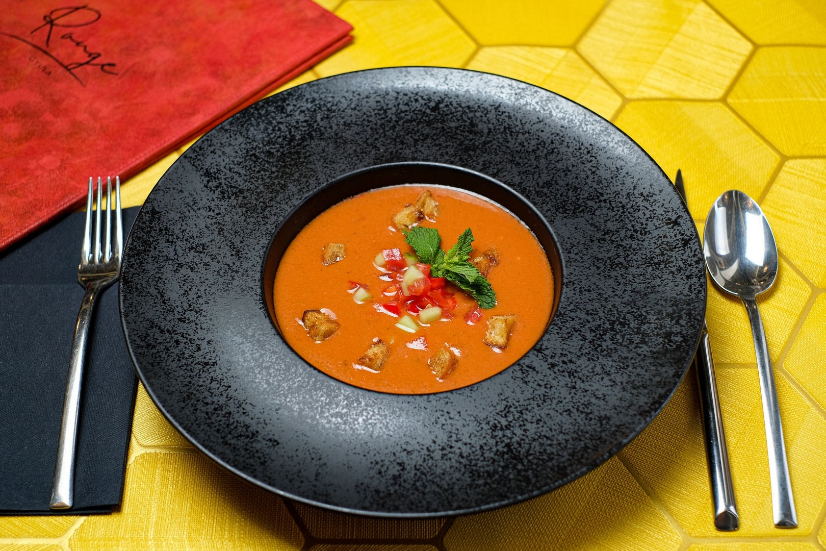 A héten a következő ételek szerepelnek a Gyula Rouge ebédajánlatában: brokkolikrémleves, görögdinnye-gazpacho salsával; brassói lángossal, zöldségekkel töltött édesburgonya, lazacos, garnélás, kókusztejes rizottó, tejszínes fokhagymás kacsatagliatelle; rosé málna és meggysorbet, meggyes tejes pite.