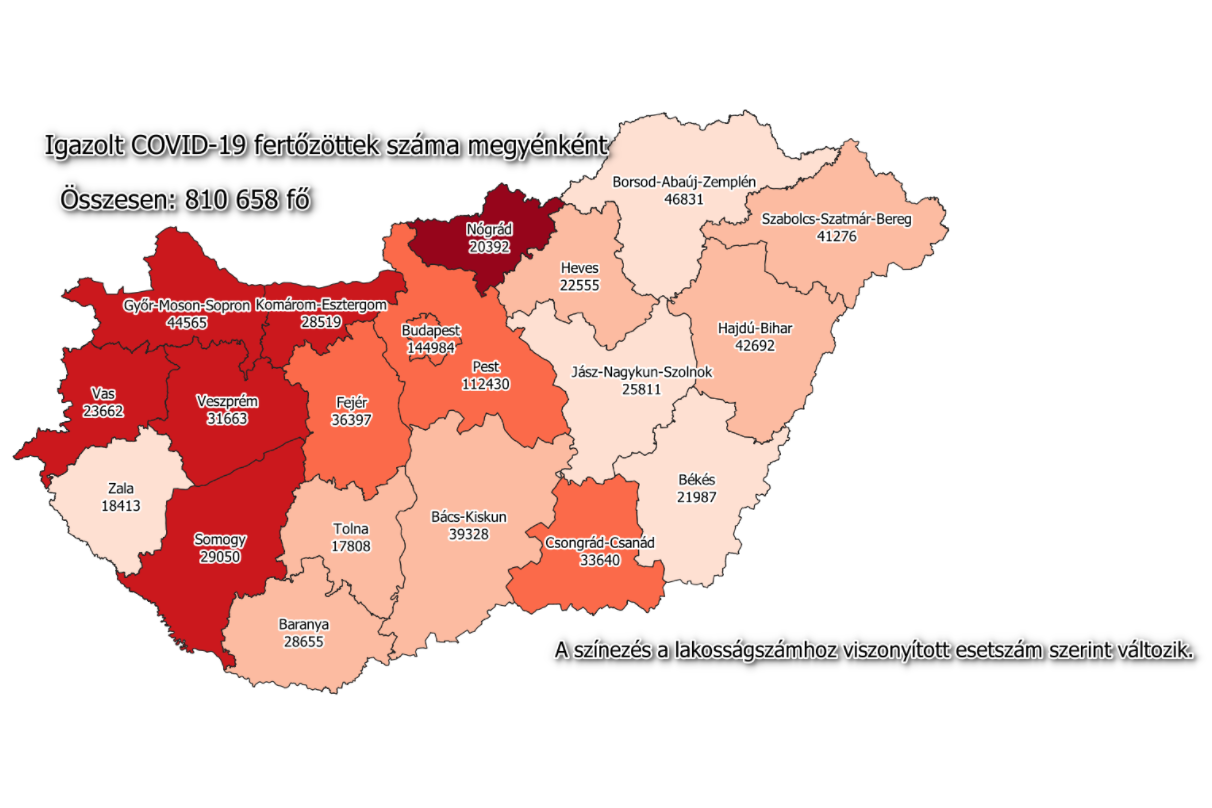 Az oldal térképe szerint eddig Budapesten (144 984) és Pest megyében (112 430) regisztrálták a legtöbb fertőzöttet. Ezt követi Borsod-Abaúj-Zemplén (46 831), Győr-Moson-Sopron (44 565) és Hajdú-Bihar megye (42 692). A fertőzésben legkevésbé érintett megye továbbra is Tolna, 17 808 fertőzöttel.