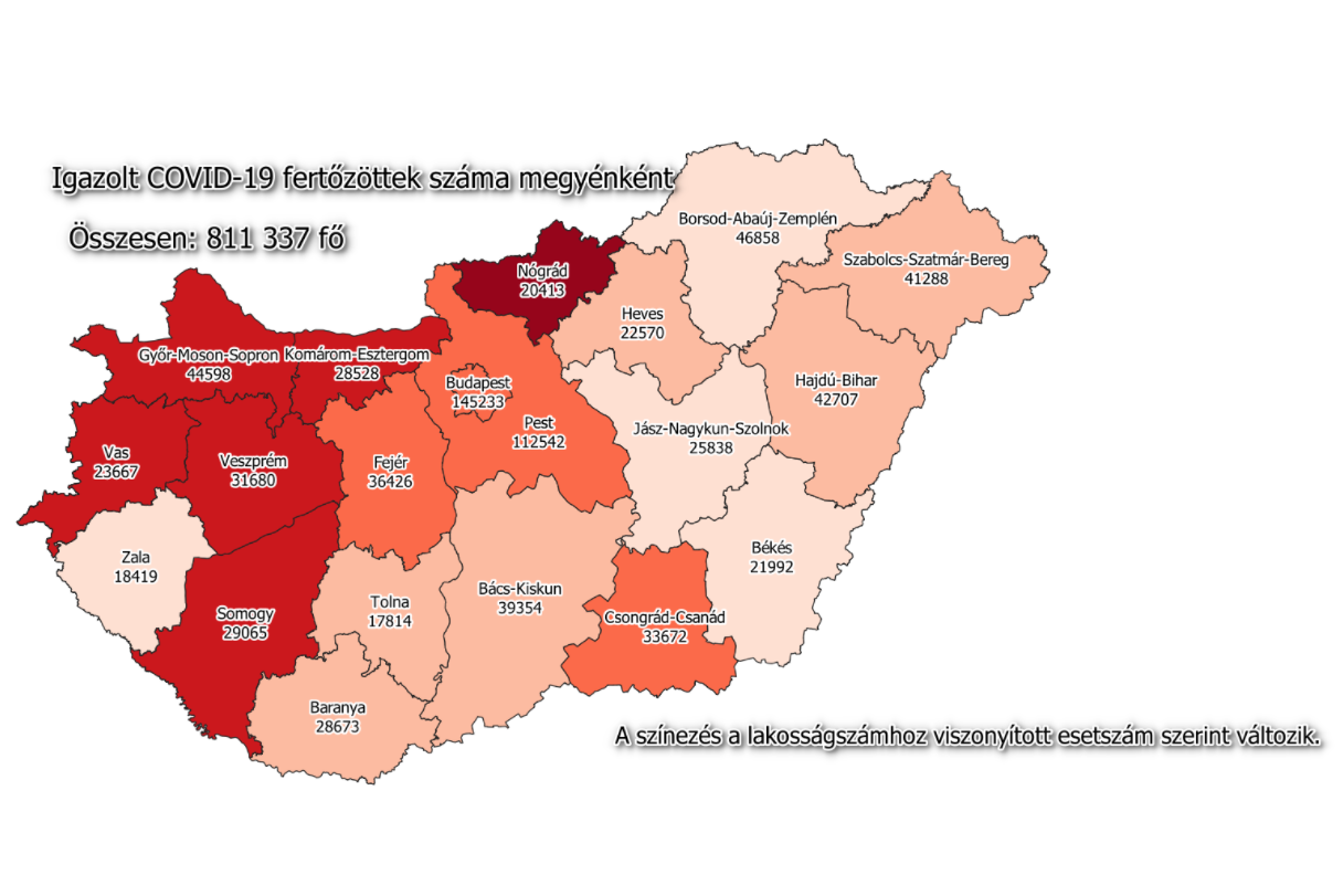 Az oldal térképe szerint eddig Budapesten (145 233) és Pest megyében (112 542) regisztrálták a legtöbb fertőzöttet. Ezt követi Borsod-Abaúj-Zemplén (46 858), Győr-Moson-Sopron (44 598) és Hajdú-Bihar megye (42 707). A fertőzésben legkevésbé érintett megye továbbra is Tolna, 17 814 fertőzöttel.