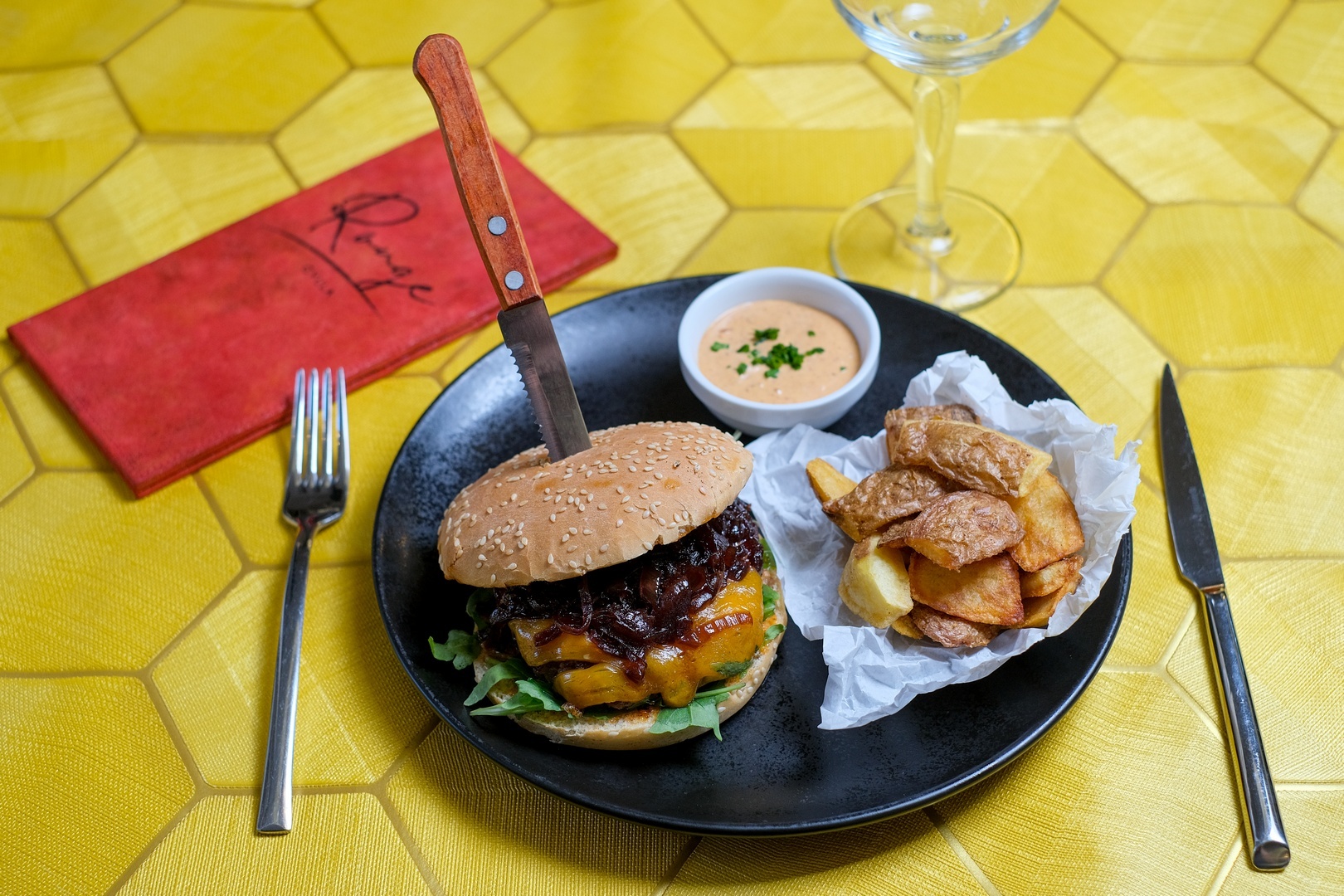 A héten következő ételek szerepelnek a Gyula Rouge ebédajánlatában: bélszíntatár, fügés kenyér, fűszerkrém, savanyított zöldségek, tojásmorzsa; Újházi-tyúkhúsleves főtt zöldségekkel, tépett tyúkkal, cérnametélttel vagy tejfölös burgonyaleves, ahogy a chéf szereti: gyulai kolbásszal, buggyantott tojással; Rouge-burger 100% marhahússal, szezámmagos bucival, hagymalekvárral, cheddar sajttal, sült burgonyahéjjal, chiptle mayóval vagy csirkemellcsíkok szezámmagos bundában kókuszos gyömbéres jázminrizzsel, fekete currys majonézzel vagy zöldborsó-variációk: főzelék, zöldborsófalafel, cukorborsó, borsócsíra vagy lazac vajas tésztában grillzöldséggel, kapros veluté mártással; tiramisu vagy egzotikus gyümölcssaláta és málnacoulis.
