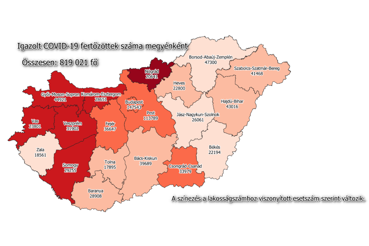 A kormányzati portálon azt írták: 819 021-re nőtt a Magyarországon azonosított fertőzöttek száma. Az elhunytak száma 30 143-ra, a gyógyultaké 781 138-ra emelkedett.