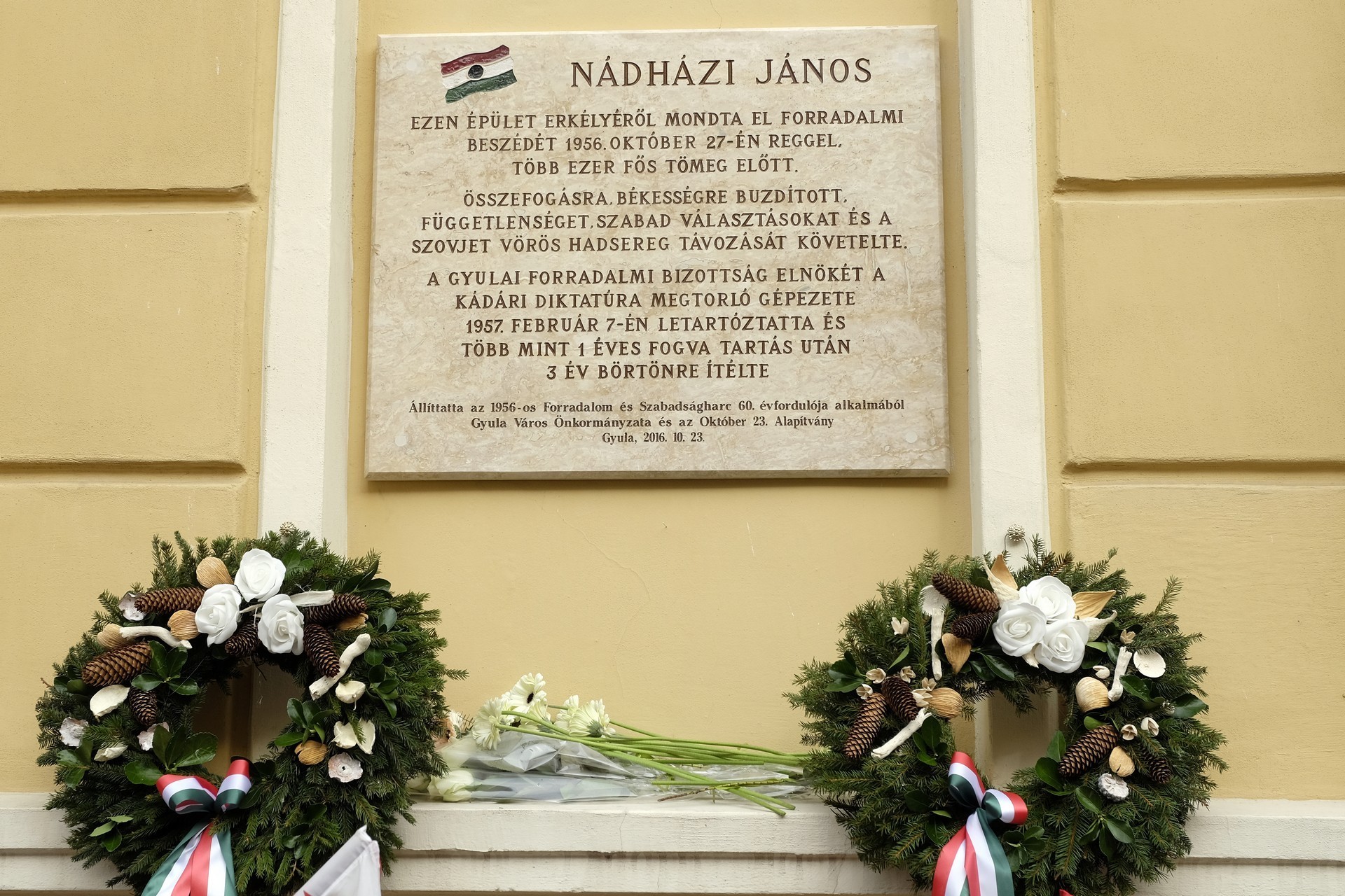5 évvel ezelőtt, 2016. október 27-én emléktáblát avattak az 1956-os forradalom jubileuma és Nádházi János tiszteletére a gyulai városháza épülete előtt. A gyulai önkormányzat és az Október 23. Alapítvány közös szervezésében helyezték el és avatták fel a köztéri alkotást. A Gyulai Forradalmi Bizottság egykori elnökének emléktábláját M. Szabó András, a város 1956-os polgármestere és a jelenlegi városvezető, Görgényi Ernő leplezte le.
