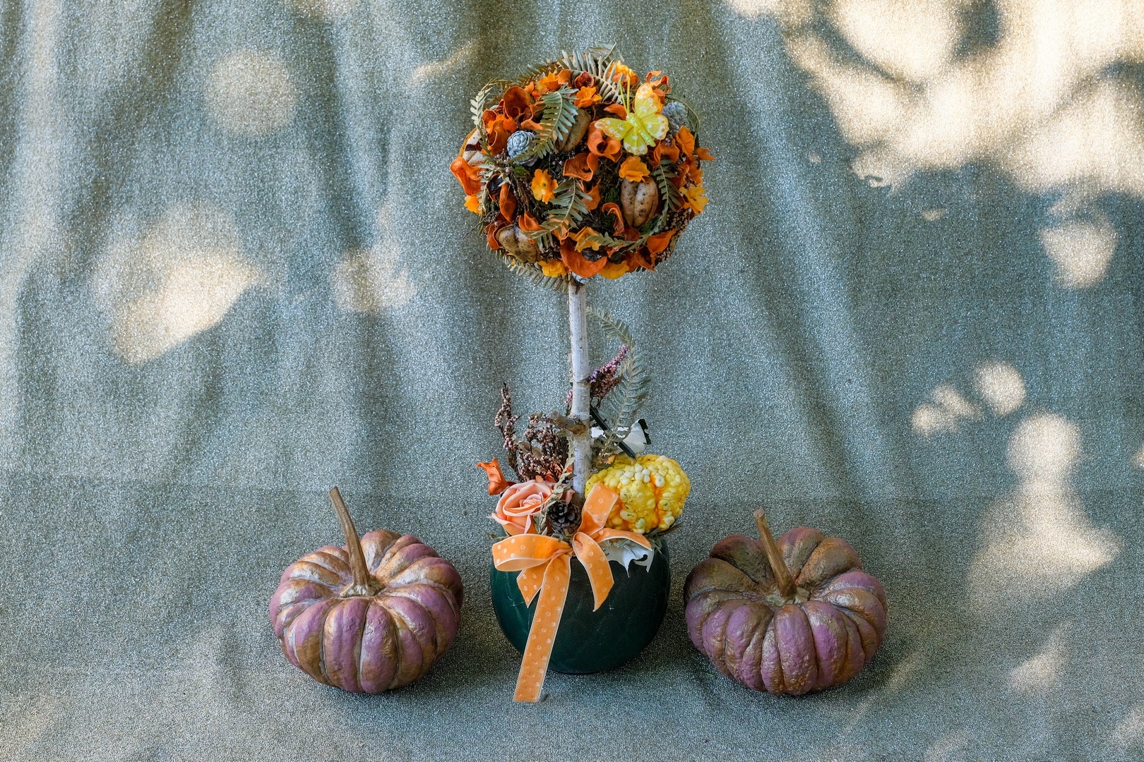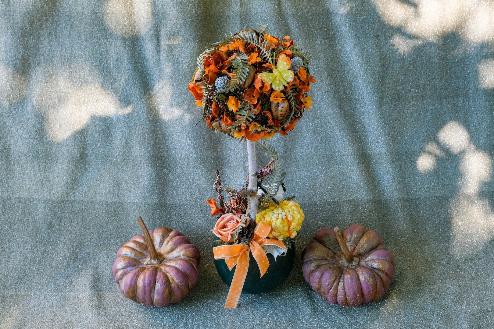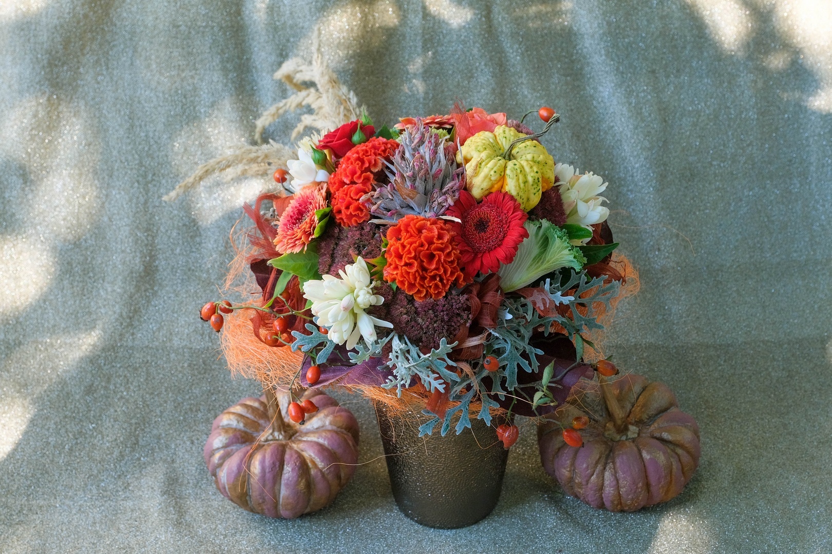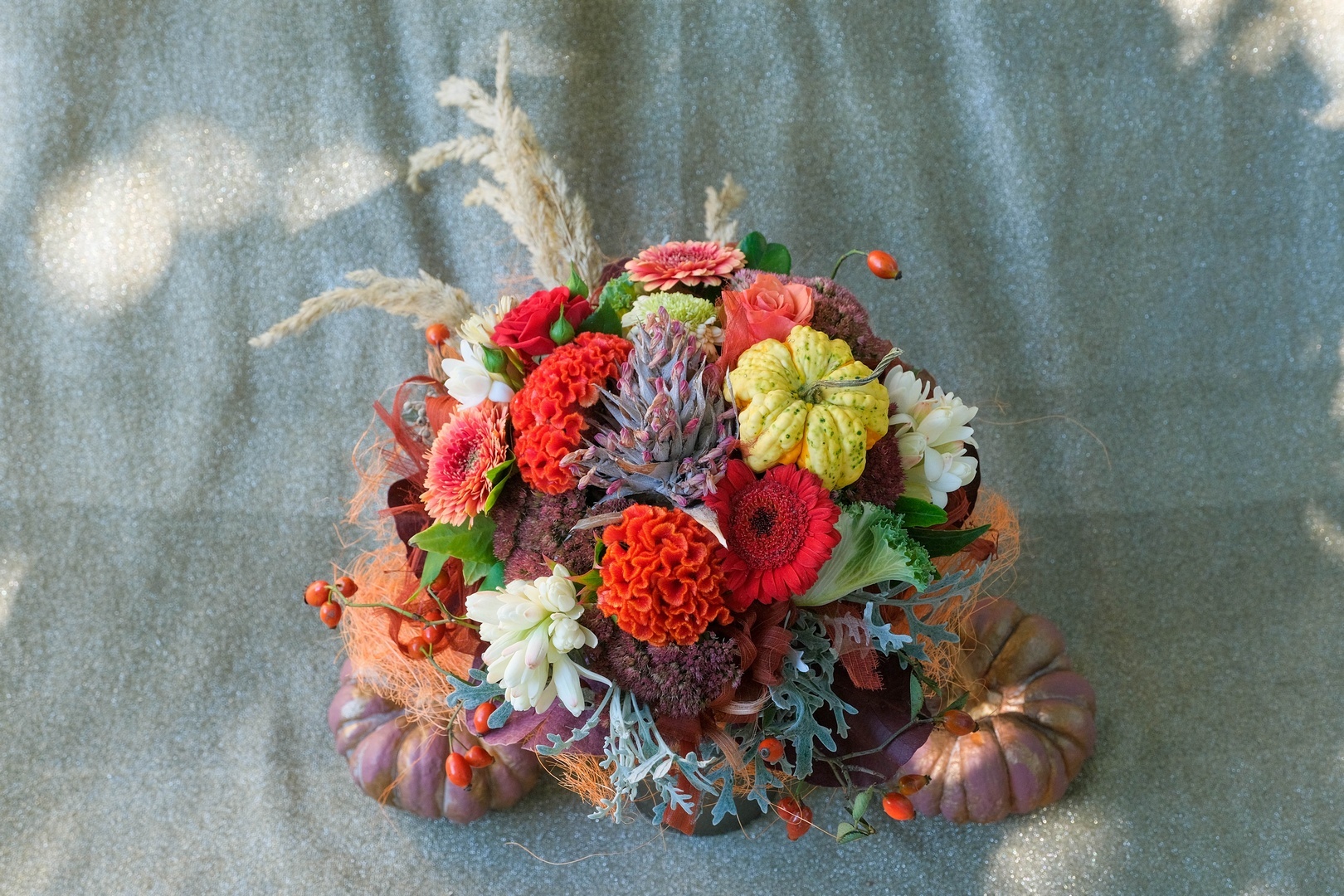 – A természetben járva gyönyörű terméseket láthatunk: csipkebogyót, berkenyét, fagyalt, vadalmát, vadkörtét. Ezek ihlették a díszeinket – fejtette ki. Hozzátette: klasszikus és modern virágkompozíciók is kaphatók a boltban, például rose goldra festett tök élő virággal, lila flamingóval és wanda orchideákkal.