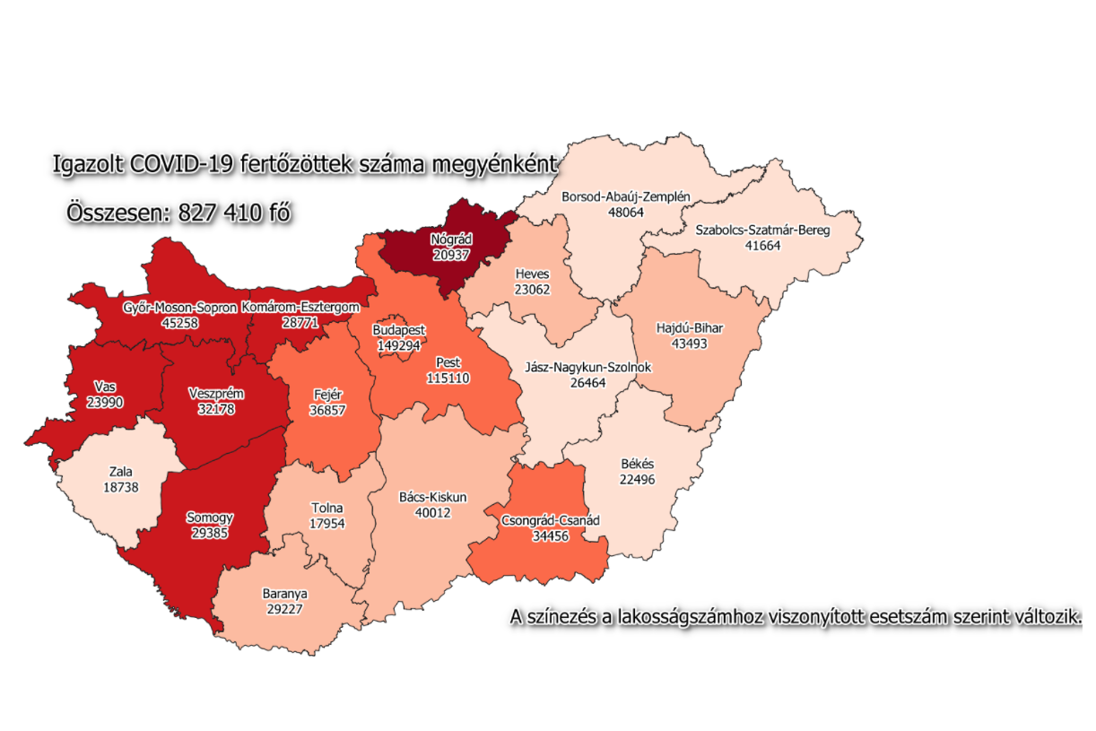 A kormányzati portálon azt írták: 827 410-re nőtt a Magyarországon azonosított fertőzöttek száma. Az elhunytak száma 30 275-re, a gyógyultaké 788 014-re emelkedett.