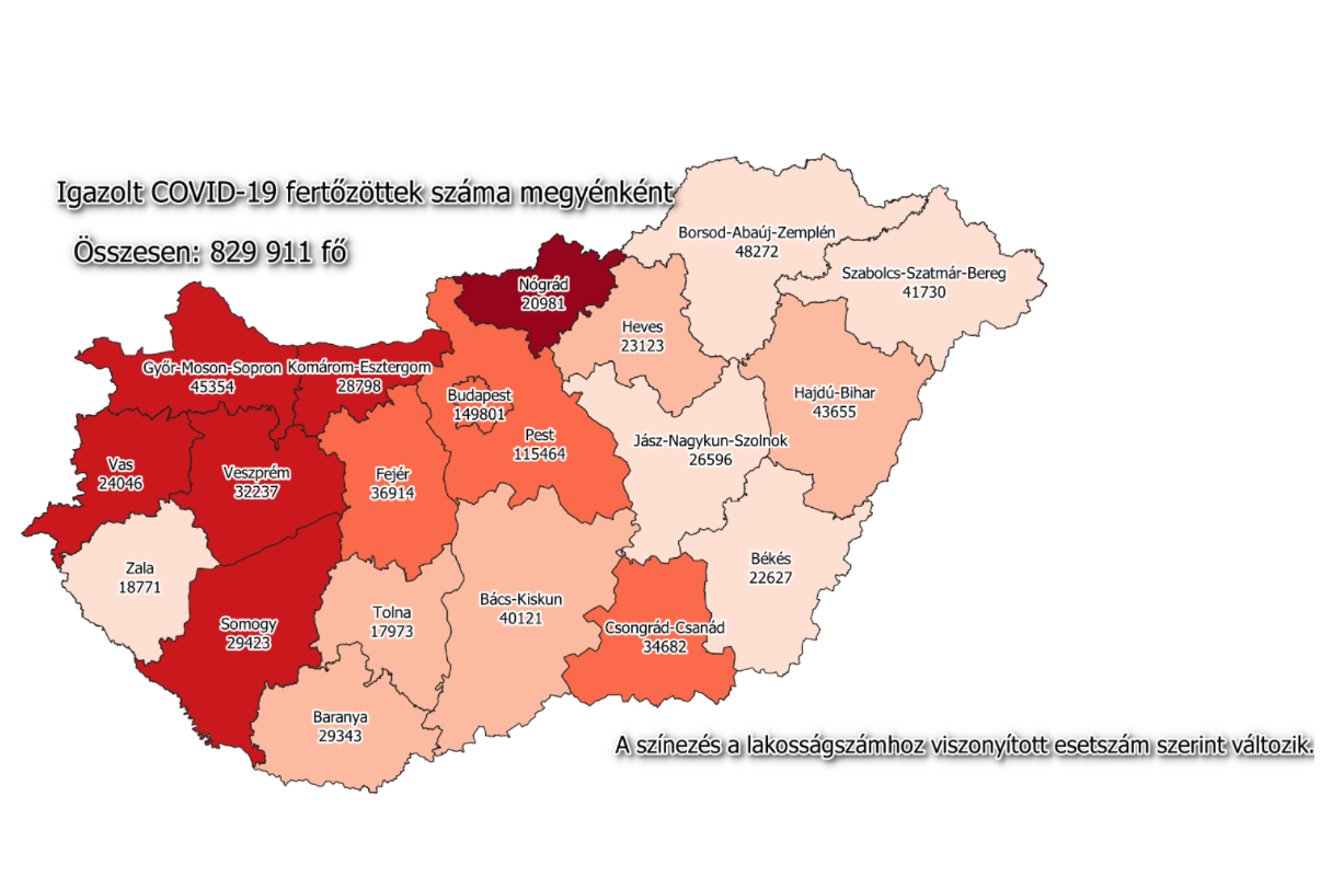 A kormányzati portálon azt írták: 829 911-re nőtt a Magyarországon azonosított fertőzöttek száma. Az elhunytak száma 30 320-ra, a gyógyultaké 789 322-re emelkedett.