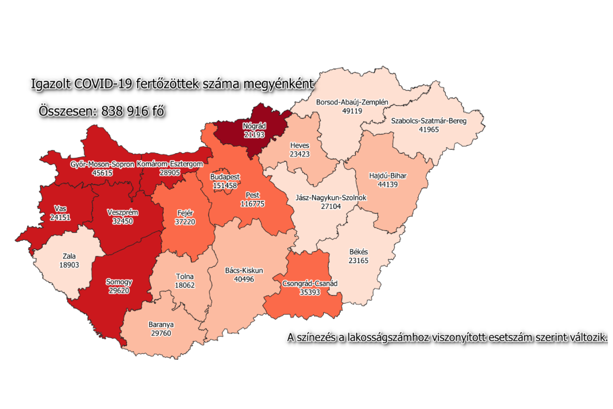 A kormányzati portálon azt írták: 838 916-ra nőtt a Magyarországon azonosított fertőzöttek száma. Az elhunytak száma 30 448-ra, a gyógyultaké 792 757-re emelkedett.