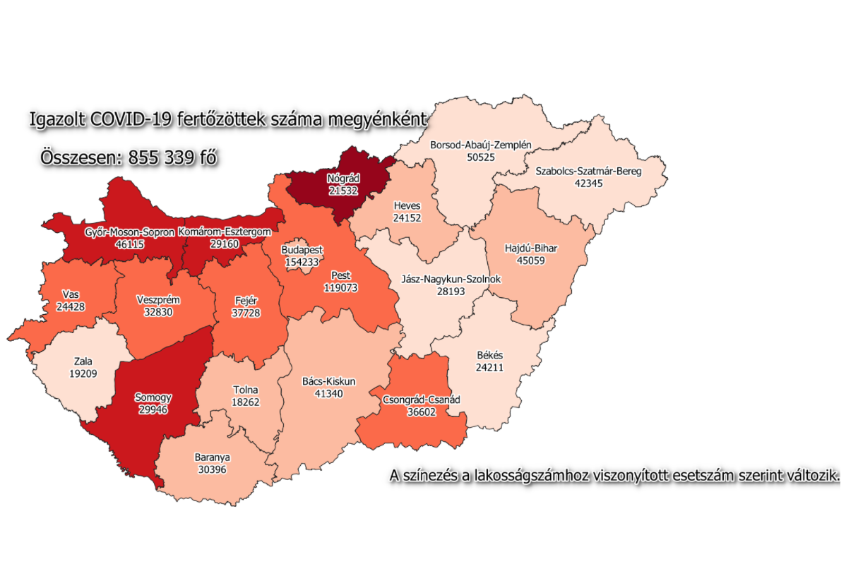 A kormányzati portálon azt írták: 855 339-re nőtt a Magyarországon azonosított fertőzöttek száma. Elhunyt 30 647 ember, a gyógyultak száma 796 435-re emelkedett. Az aktív fertőzöttek száma 28 257.