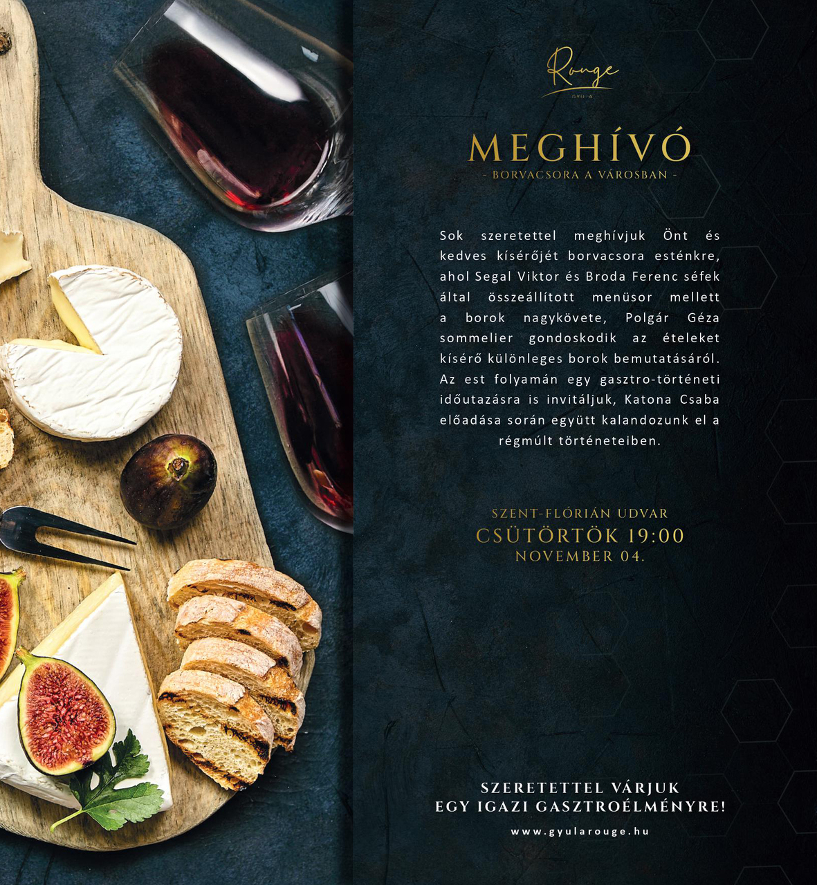 Borvacsorára és gasztrotörténeti időutazásra invitálja az érdeklődőket a Szent Flórián házban található Gyula Rouge étterem november 4-én, csütörtökön 19 órakor.