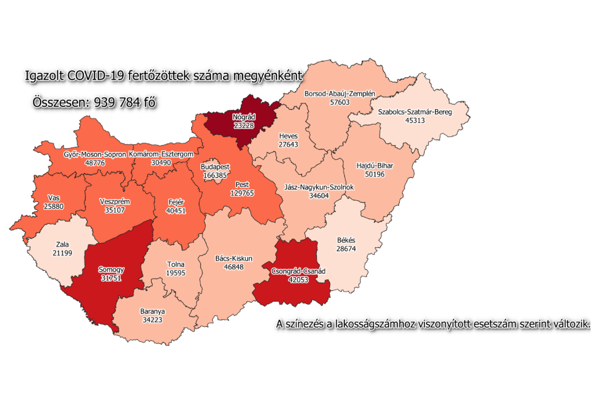 A kormányzati portálon azt írták: 939 784-re nőtt a Magyarországon azonosított fertőzöttek száma. Elhunyt 31 867 ember, a gyógyultak száma 818 336-ra emelkedett. Az aktív fertőzöttek száma 89 581.