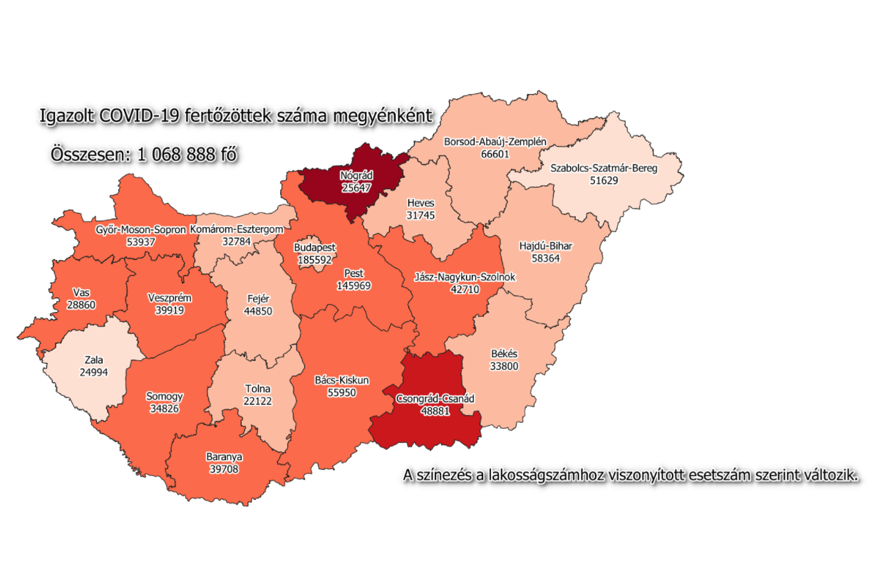 A kormányzati portálon azt írták: 1 068 888-ra nőtt a Magyarországon azonosított fertőzöttek száma. Elhunyt 33 866 ember, a gyógyultak száma 862 534-re emelkedett. Az aktív fertőzöttek száma 172 488.