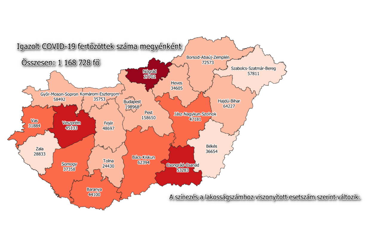 A kormányzati portálon azt írták: 1 168 728-ra nőtt a Magyarországon azonosított fertőzöttek száma. Elhunyt 36 048 ember, a gyógyultak száma 948 385-re emelkedett. Az aktív fertőzöttek száma 184 295.
