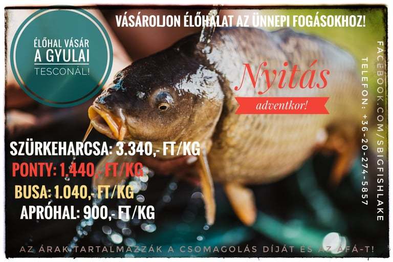 Kiemelte: a gyulai Tesco mellett az advent kezdetétől árulnak a környező halgazdaságokból származó élő halat: szürkeharcsát, pontyot, busát és apróhalakat. Reggel 8 órától este 19 óráig várják a vevőket, a karácsonyi időszak közeledtével viszont kitolják a zárórát.