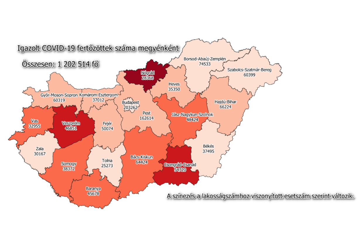A kormányzati portálon azt írták: 1 202 514-re nőtt a Magyarországon azonosított fertőzöttek száma. Elhunyt 37 079 ember, a gyógyultak száma 996 517-re emelkedett. Az aktív fertőzöttek száma 168 918.