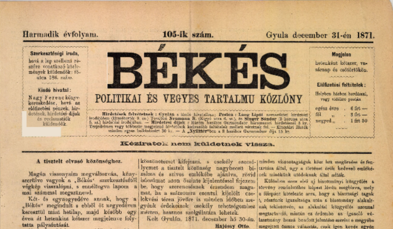 150 évvel ezelőtt, 1871. december 31-én szűnt meg az 1869-ben Gyulán megjelent Békés [1] című hetilap. A lap felelős szerkesztője és kiadója Hajóssy Ottó volt.