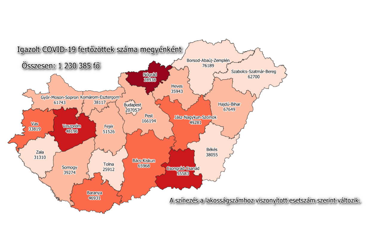 A kormányzati portálon azt írták: 1 230 385-re nőtt a Magyarországon azonosított fertőzöttek száma. Elhunyt 38 028 ember, a gyógyultak száma 1 054 288-ra emelkedett. Az aktív fertőzöttek száma 138 069.