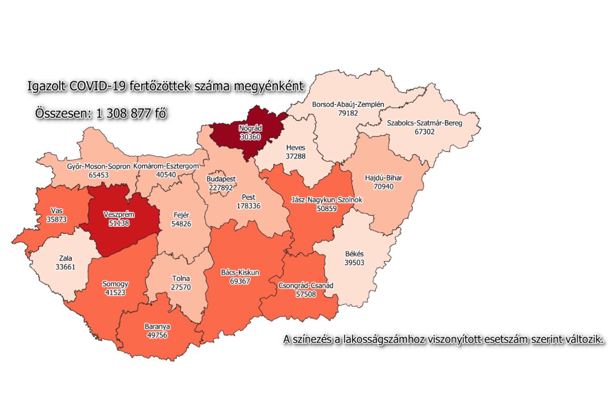 A koronavirus.gov.hu oldal térképe szerint eddig Budapesten (227 892) és Pest megyében (178 336) regisztrálták a legtöbb fertőzöttet. Ezt követi Borsod-Abaúj-Zemplén (79 182), Hajdú-Bihar (70 940), Bács-Kiskun (69 367), Szabolcs-Szatmár-Bereg (67 302) és Győr-Moson-Sopron megye (65 453). A fertőzéssel legkevésbé érintett megye továbbra is Tolna (27 570).