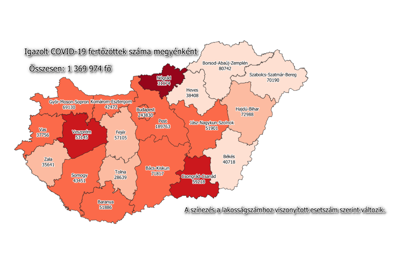 A koronavirus.gov.hu oldal térképe szerint eddig Budapesten (243 830) és Pest megyében (189 763) regisztrálták a legtöbb fertőzöttet. Ezt követi Borsod-Abaúj-Zemplén (80 742), Hajdú-Bihar (72 988), Bács-Kiskun (71 817), Szabolcs-Szatmár-Bereg (70 190) és Győr-Moson-Sopron megye (69 130). A fertőzéssel legkevésbé érintett megye továbbra is Tolna (28 639).