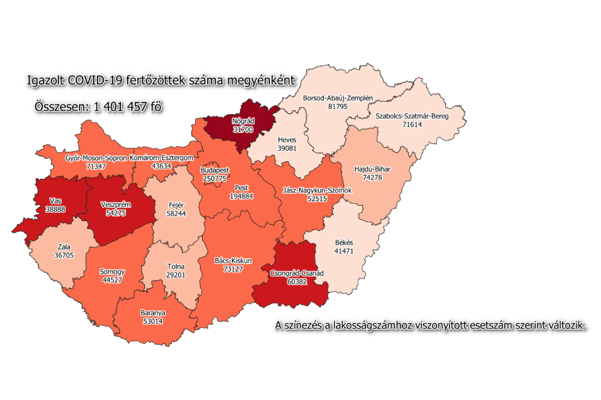 A koronavirus.gov.hu oldal térképe szerint eddig Budapesten (250 775) és Pest megyében (194 884) regisztrálták a legtöbb fertőzöttet. Ezt követi Borsod-Abaúj-Zemplén (81 795), Hajdú-Bihar (74 278), Bács-Kiskun (73 127), Szabolcs-Szatmár-Bereg (71 614) és Győr-Moson-Sopron megye (71 347). A fertőzéssel legkevésbé érintett megye továbbra is Tolna (29 201).