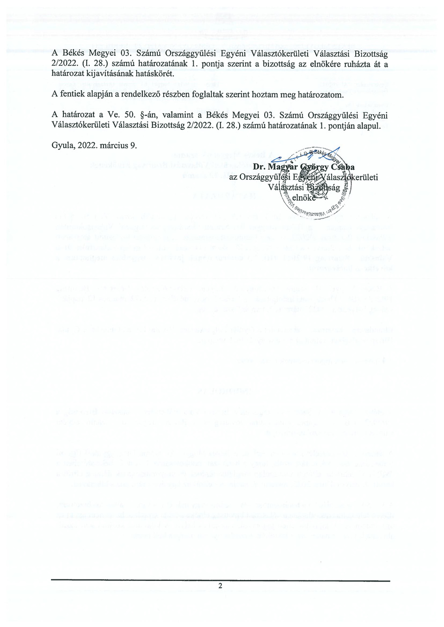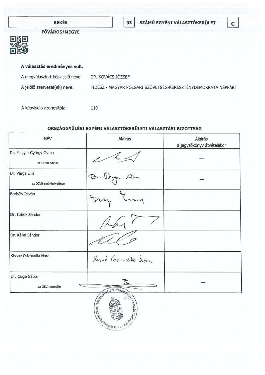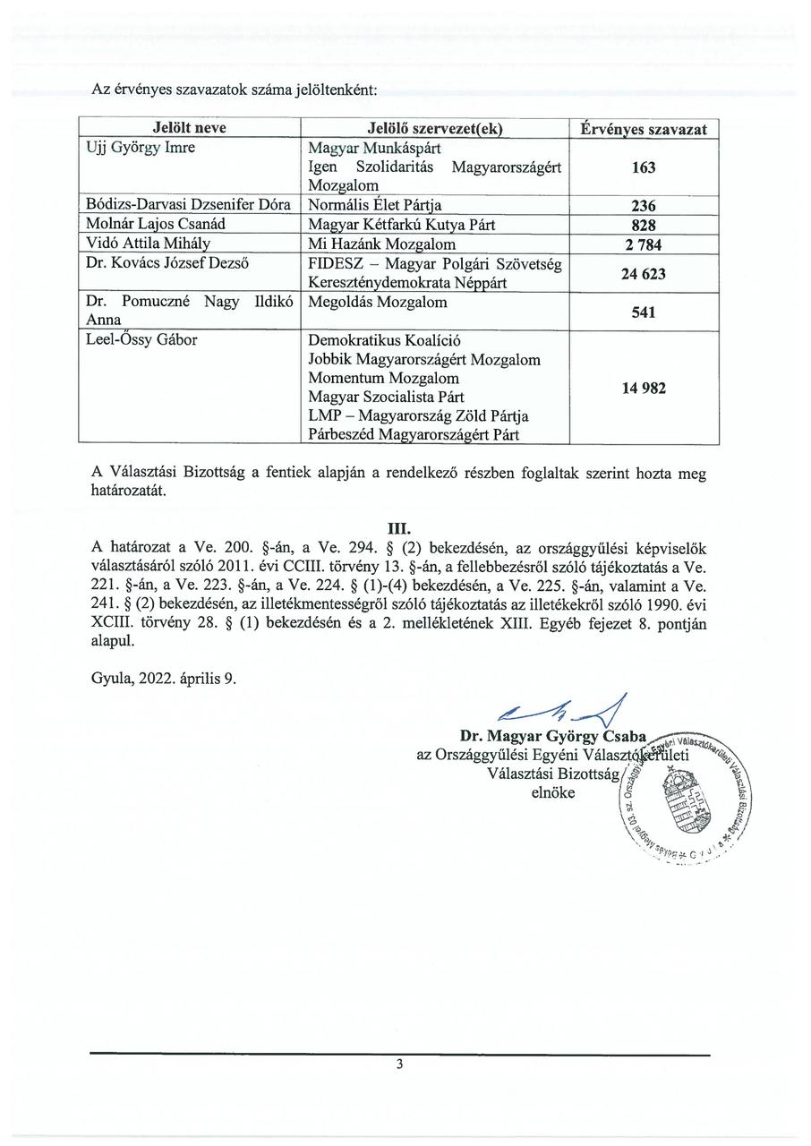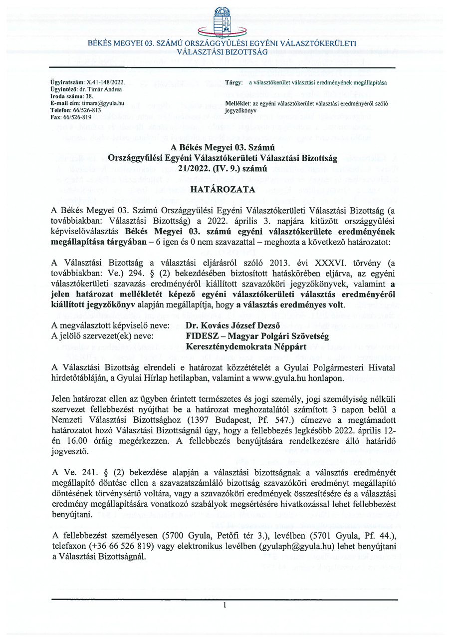 A Békés Megyei 03. Számú Országgyűlési Egyéni Választókerületi Választási Bizottság Dr. Magyar György Csabát a bizottság elnökének, Dr. Varga Lillát a bizottság elnökhelyettesének megválasztotta.