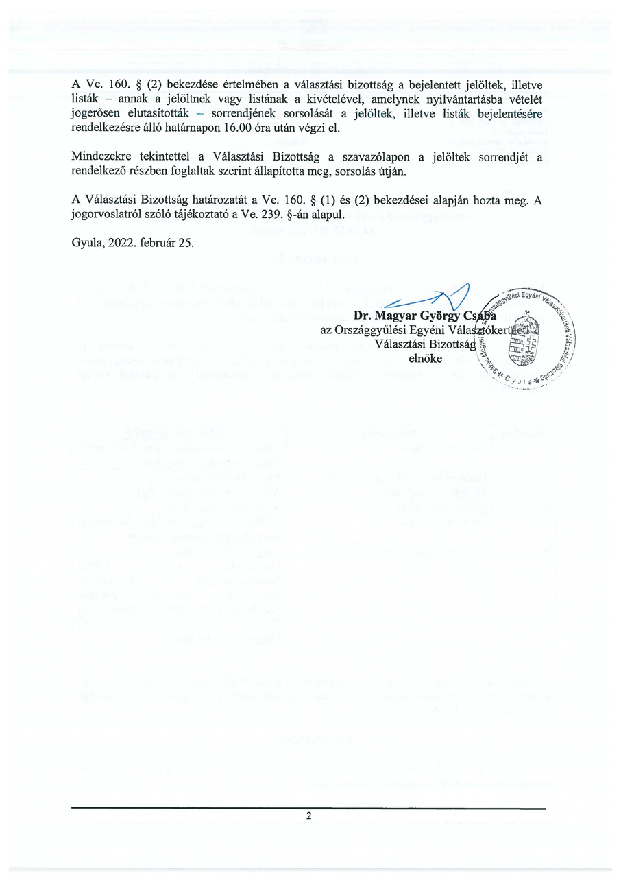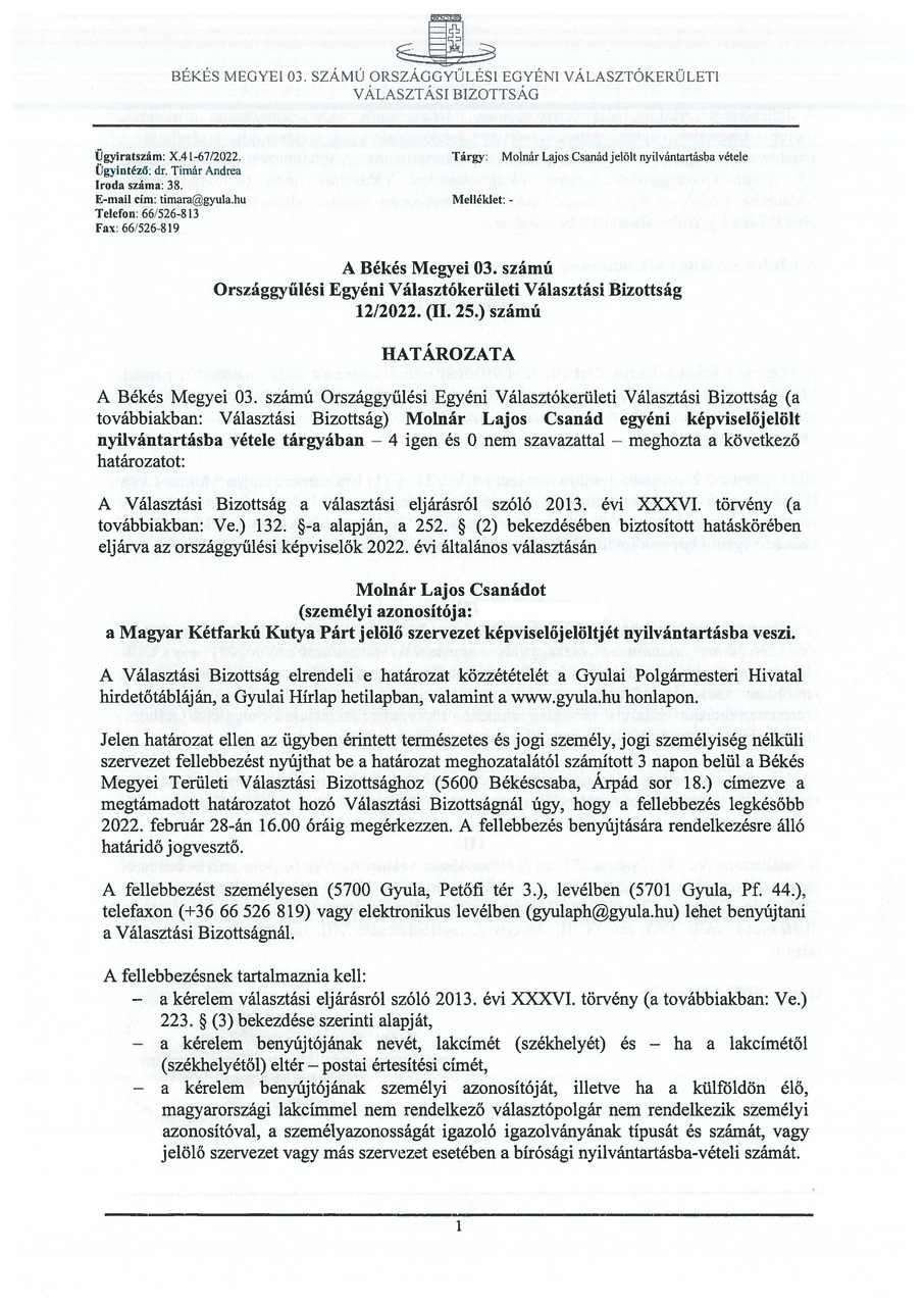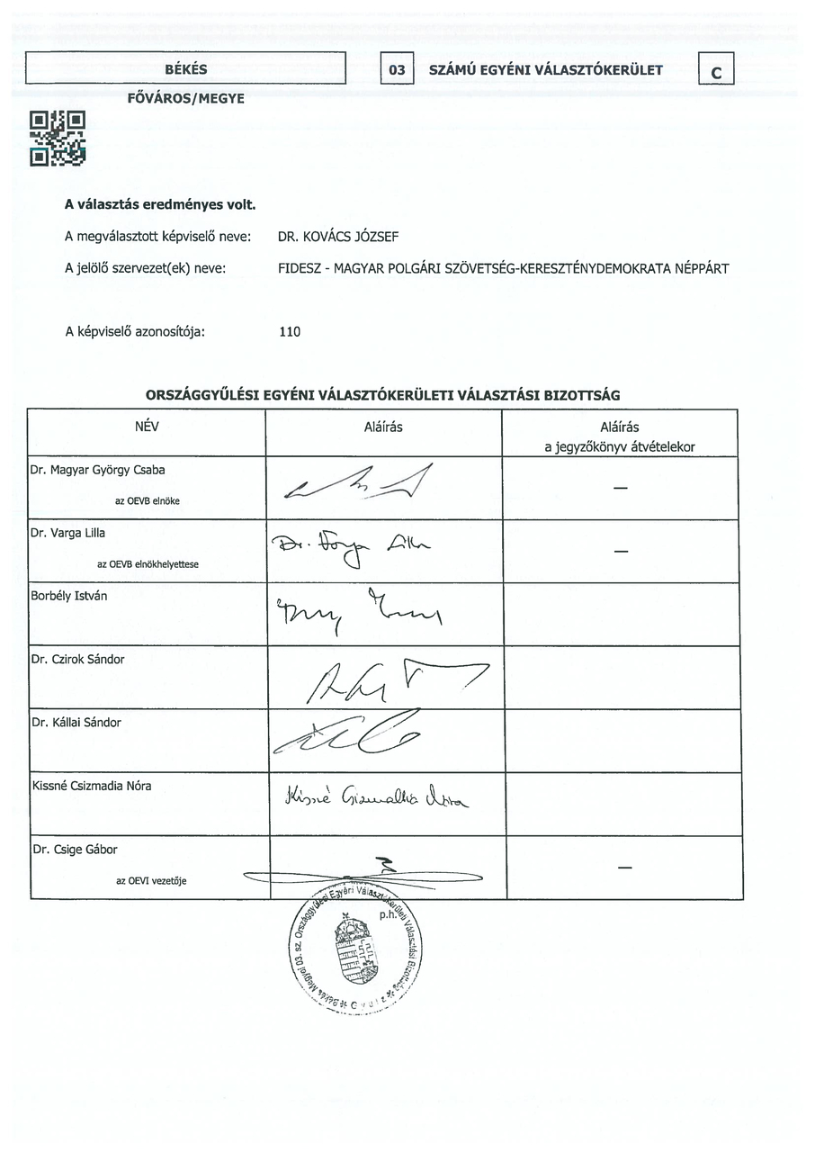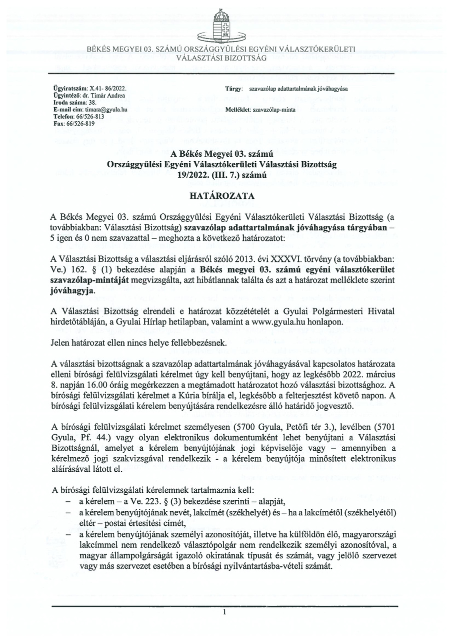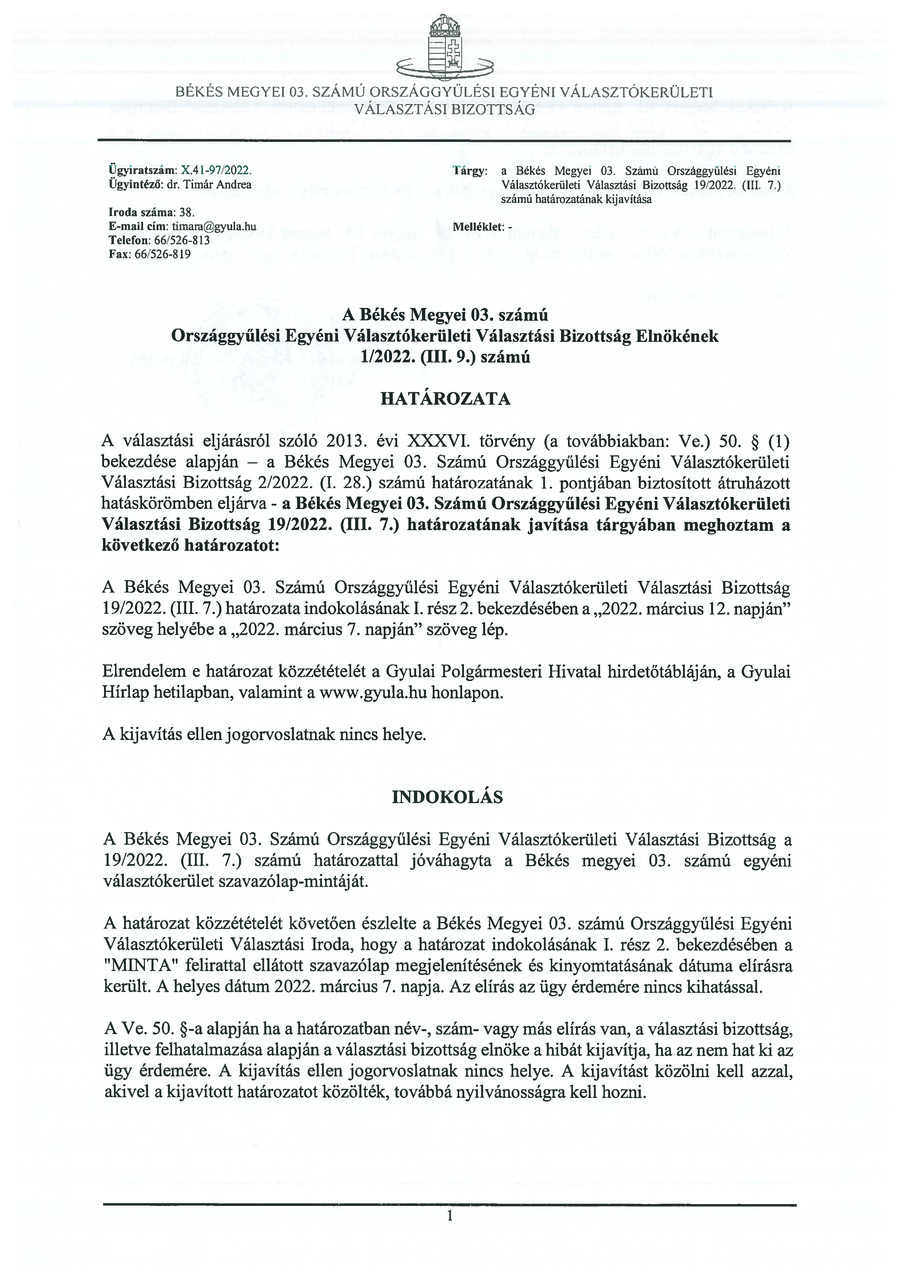 A Békés Megyei 03. Számú Országgyűlési Egyéni Választókerületi Választási Bizottság Dr. Magyar György Csabát a bizottság elnökének, Dr. Varga Lillát a bizottság elnökhelyettesének megválasztotta.